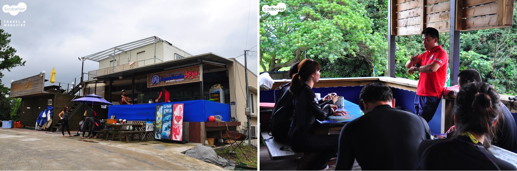 화순항의 어촌계 건물을 개조하였다는 리조트 건물은 원래는 단층이었던 콘크리트 건물에 나무로 테라스를 만들고 2층을 올려 휴게실과 게스트 하우스 형식의 숙소를 만들었다. 샤워실과 탱크 충전실은 별도의 건물로 꾸몄다. 차가운 콘크리트 건물에 나무로 따뜻함을 편의성을 덧대었는데 이 모든 것이 아쿠아 스쿠버의 회원들과 송태민 CD가 직접 손으로 만든 것이라고 한다. 많은 수의 회원들 중에는 다양한 직업과 재능을 가진 사람들이 있고 이들의 열정이 쏟아져 아쿠아 스쿠바를 만들고 있는 것이다.