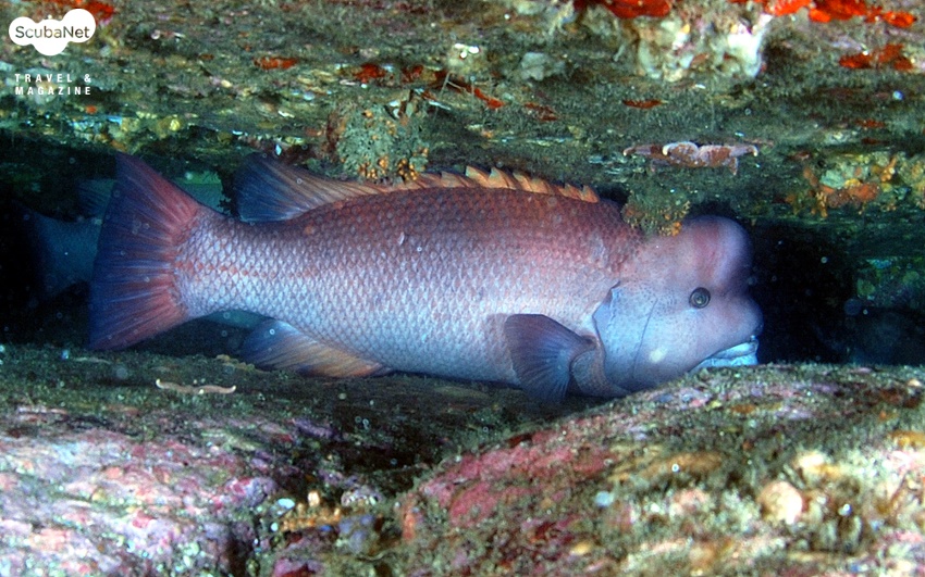 혹돔은 농어목 놀래기과에 속하며 학명은 Semicossyphus reticulatus입니다. 서태평양 고유종으로 우리나라, 중국, 일본 연안에 살고 있습니다. 나폴레옹피쉬와 비슷한 형태를 갖고 있으며 우리나라에서 볼 수 있는 가장 큰 놀래기과 어류입니다. 영어 이름은 수컷의 경우 나이가 들면서 이마 부분에 혹이 튀어나와 Bulgyhead wrasse이며, 일본명 역시 혹과 관련하여 코부다이(コブダイ)입니다. 다 자라면 몸이 붉은 기가 도는 검은색으로 됩니다.