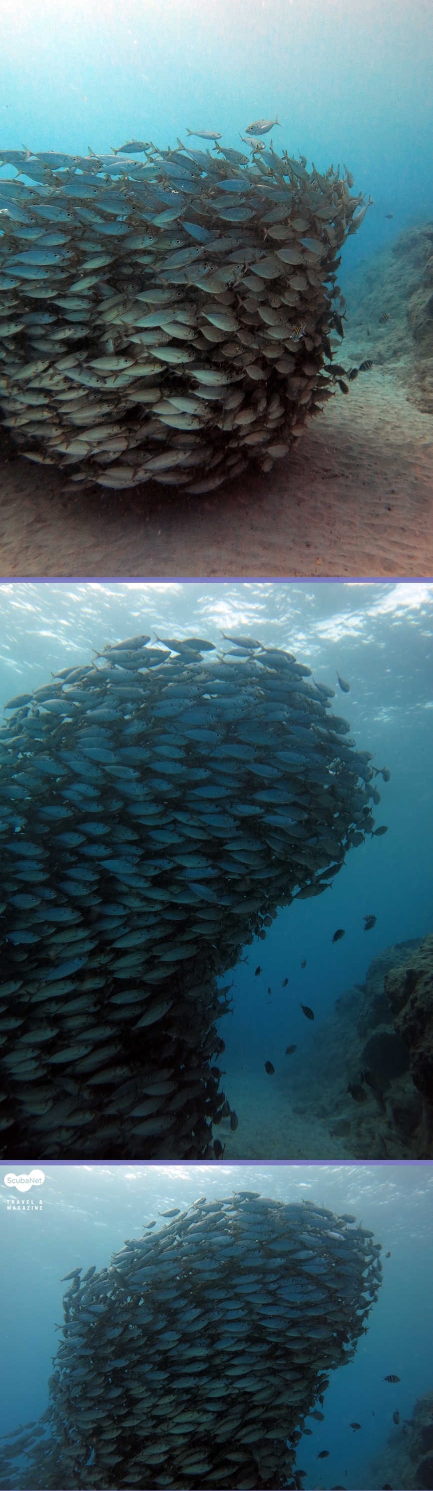 (1) 라우라우비치의 전갱이 떼와 블루핀 트레발리 떼라우라우비치의 전갱이 떼는 매 다이빙시 마주칠 수 있습니다. 점점 그 규모가 작아지고 있다고는 하나, 여전히 멋진 광경이었습니다. 발리카삭의 잭피쉬 스쿨링, 시파단의 잭피쉬, 바라쿠다 스쿨링과 비교하면 그 규모 면에서 작을지도 모르나 제가 느낀 감동은 그것과 비교해도 손색이 없었습니다. 10m도 안 되는 수심의 빛이 충분한 환경에 맑은 시야까지 합해진 곳에서 전갱이 스쿨링은 그만의 매력이 충분했습니다. 특히나 마지막 다이빙에서 블루핀 트레발리 20마리가 전갱이 떼를 사냥하는 광경을 약 한시간 (총 다이빙타임 75분) 간 볼 수 있었던 것은 정말 행운이었습니다. 마치 전갱이 떼들이 다이버에게 도움이라도 구하듯 주위를 에워싸며 스쿨링을 하며 블루핀 트레발리들을 피하는 장면, 정말 눈깜짝할 사이에 사냥에 성공하여 배가 불러온 블루핀 트레발리들의 모습은 아직도 잊혀지질 않습니다.