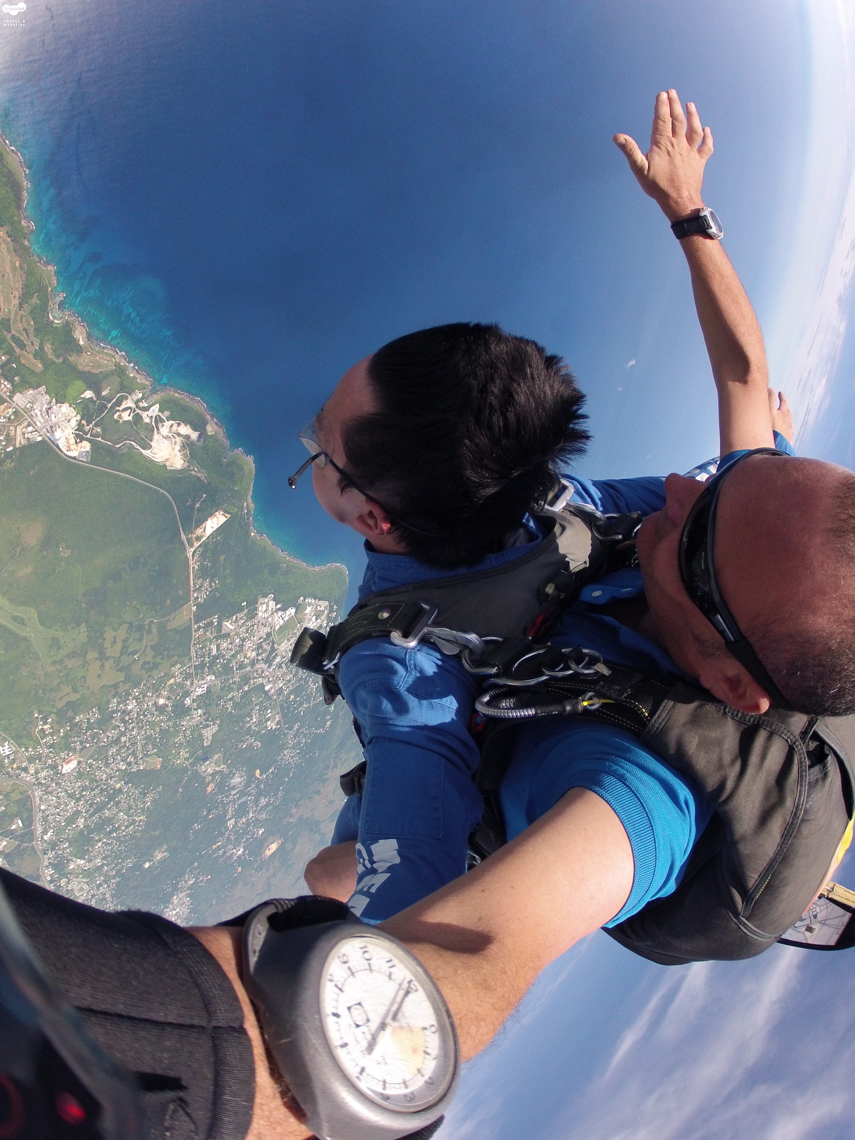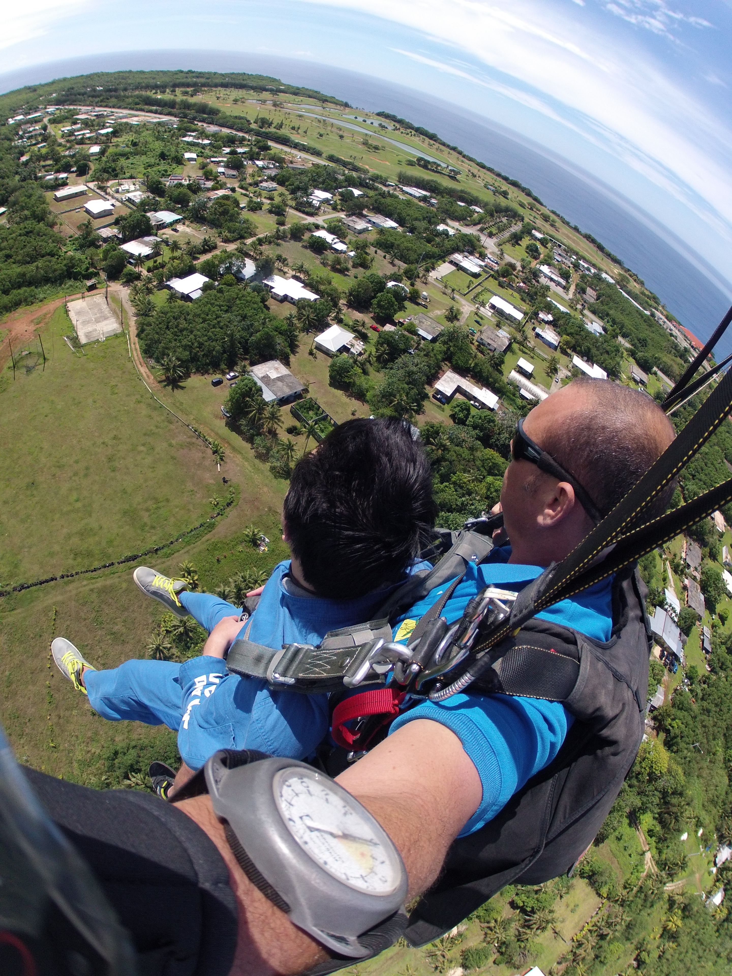 괌 공항 근처에 스카이다이브괌이라는 곳에서 체험할 수 있습니다. 해발 4200m 상공에서 자유낙하 1분, 낙하산으로 5분 정도 낙하하게 되는 것입니다. 스카이다이빙 체험은 전문가와 함께 하는 2인조 다이빙인 팬덤 방식으로 진행되는데 함께 하는 전문 스카이다이버가 자세를 잡아주고, 낙하산 조정까지 해서 안전하게 착지까지 할 수 있도록 도와줍니다. 짧다면 짧은 시간이지만 4000m 상공에서 자유낙하로 떨어지는 느낌 그리고 낙하산을 펼치고 내려오면서 한눈에 들어오는 바다와 육지의 경치 등은 말로 표현하기 힘들 정도로 굉장한 기분이 듭니다. 정말 한 번 꼭! 해볼만한 체험이었습니다.