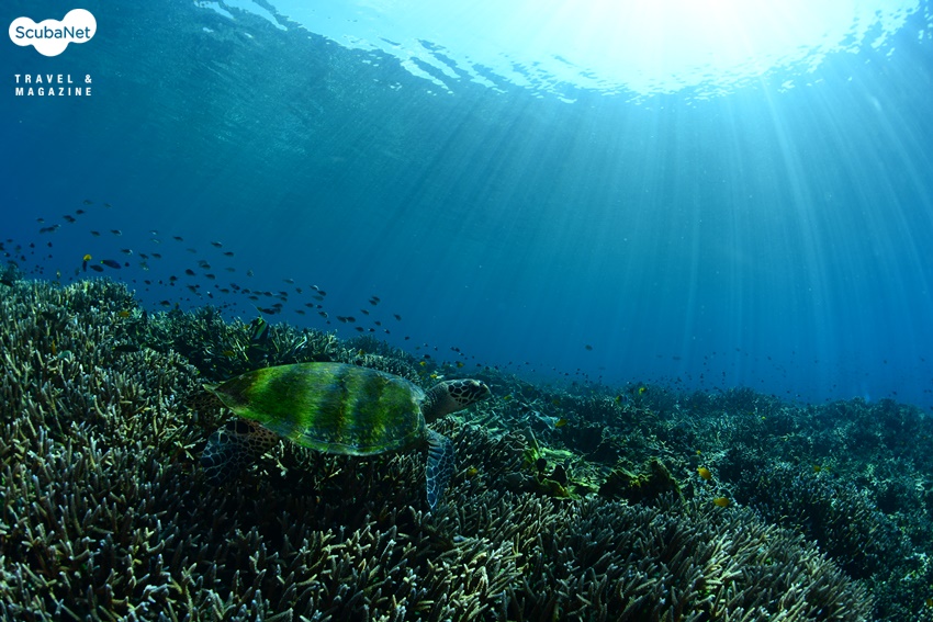 햇빛이 좋은 산호밭 위를 유영하는 바다거북