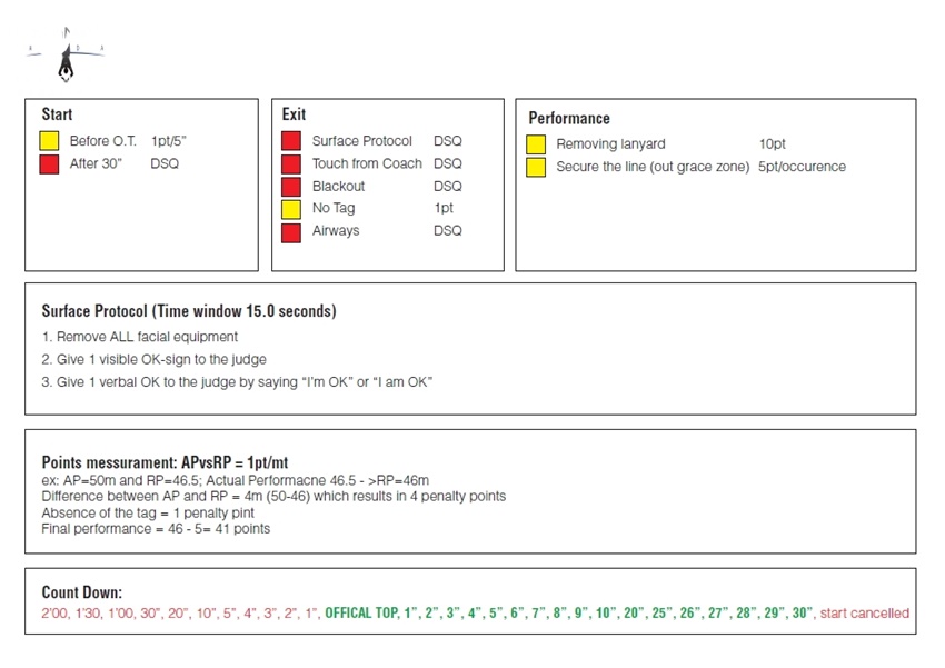다이빙 중에는, 랜야드를 제거할 경우 10점의 감점을 당하며, 바텀 플레이트에서 2m(그레이스존이라 함) 밖에서 줄을 잡는 경우 5점의 감점이 있습니다. 이는 모두 옐로우 카드입니다. 줄잡는 종목인 FIM의 경우에는 해당사항 없습니다.