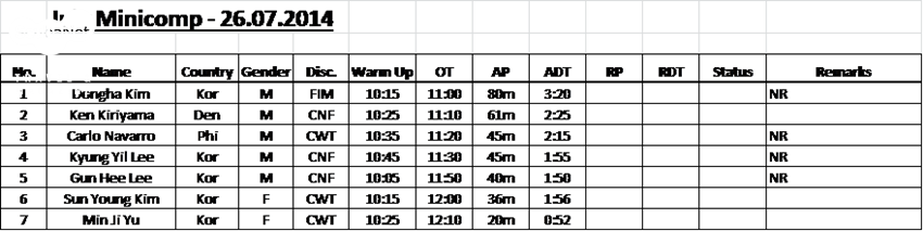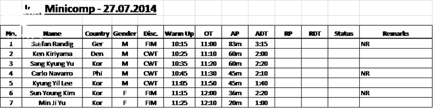 스타트 리스트 보는 방법먼저 스타트 리스트를 보는 방법을 안내 드려야 할 것 같네요. No는 다이빙을 하는 순서입니다. 그리고는 이름, 국적, 성별, 다이빙을 할 종목, 웜업에 들어갈 수 있는 시간, OT는 실제 입수해야 하는 시간, AP는 대회 전 신청한 수심, ADT는 신청한 수심의 다이빙 시간을 나타냅니다.