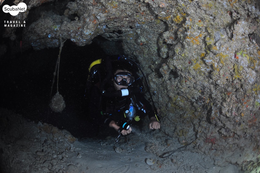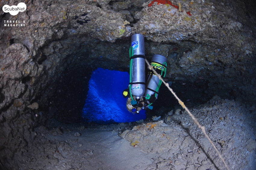 먼저 블루홀 바닥의 수심 23m 지점에서 보면 전기 조개가 서식을 하는 곳에 작은 구멍이 하나 있다. 입구의 크기는 1m 안쪽의 작은 구멍이며, 이 입구를 통과하면 거짓말처럼 넓은 공간이 펼쳐진다. 블랙홀 안에는 이미 누군가가 설치한 메인 라인이 있었고, 중간에 에로우들도 붙어 있었다. 바닥수심은 최대 42m까지 이르는데 바닥은 머드 상태의 침전물이 가득했다. 동굴의 폭은 약 15m 정도, 높이는 약 24m 이며, 천정의 수심은 18m 정도된다. 길이는 약 80m~ 100m 정도로 추측되며 메인 라인을 따라 가다 보면 동굴의 끝부분이 나온다.