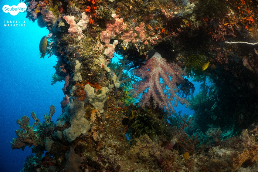 산호초의 연산호와 바다나리를 촬영하면서 다양한 각도로 촬영한 사진으로, 1번 사진은 물공간이 적으며 어둡게 표현되어 답답한 느낌이지만, 2번 사진은 물공간이 넉넉하며 물색이 표현이 풍부하여 피사체가 살아나는 사진이다. Balicasag, Bohol, Philippines. Sony RX100, Patima housing, Sea&Sea YS-D1 x2, M mode, AWB, f8, 1/1000s, ISO 100