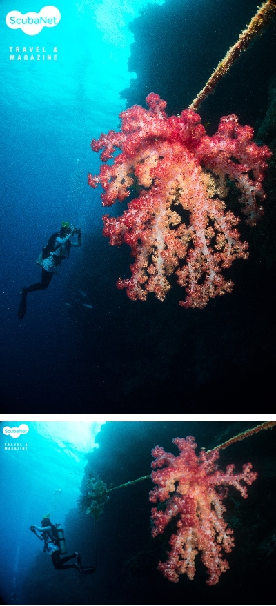 위에서부터 1,2,3,4,-수중의 밧줄에 서식하는 연산호를 피사체로 하여 배경의 물색을 효과적으로 촬영하기 위하여 세로와 가로방향의 두