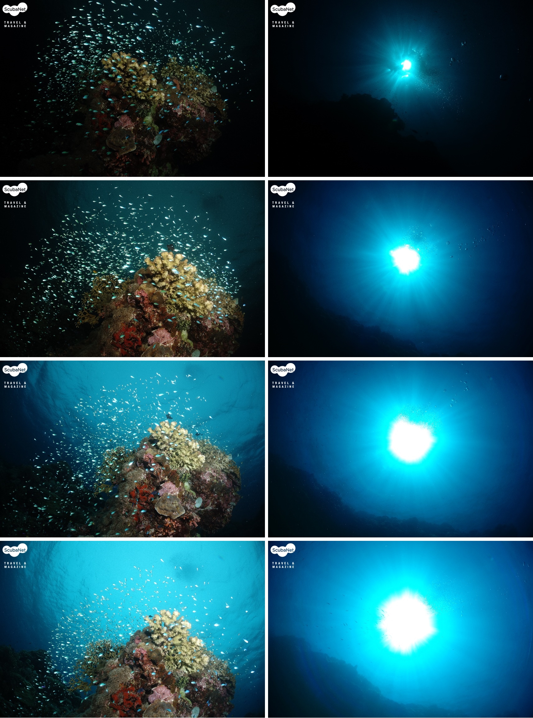 산호초에 작은 물고기가 모여있는 것을 표현하기 위하여 자연광 노출을 단계별로 다양하게 브라케팅 촬영한 사진. 작은 물고기가 스트로브 빛을 반사해 밝게 빛나기 때문에 배경 물색이 어두운 것이 물고기를 강조하는데는 효과적이다. Doljo beach, Bohol, Philippines. Sony RX100, Patima housing, Sea&Sea YS-D1 x2, M mode, AWB, f11, 1/2000s, 1/500s, 1/100s, 1/60, ISO 100 5~6 한낮에 밝게 비치는 태양을 효과적으로 표현하기 위하여, 조리개를 최대한 조이고 셔스피드를 조절하여 단계별로 촬영한 사진. Balicasag, Bohol, Philippines. Sony RX100, Patima housing, M mode, AWB, f11, 1/2000s, 1/500s, 1/250s, 1/125s, ISO 100