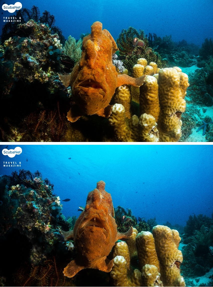 가지로 촬영을 하였다. 세로 사진이 장축을 따라 물색의 변화가 풍부하게 표현되었다. Balicasag, Bohol, Philippines. Sony RX100, Patima housing, Sea&Sea YS-D1 x2, M mode, AWB, f8, 1/50s, ISO 200 3 4 해면위에 자리잡고 있는 플로그피시를 수평앵글과 상향앵글로 촬영한 사진으로 물색을 풍부하게 표현하는데는 상향앵글이 유리하다. Balicasag, Bohol, Philippines. Sony RX100, Patima housing,Sea&Sea YS-D1 x2, M mode, AWB, f8, 1/400s, ISO 200