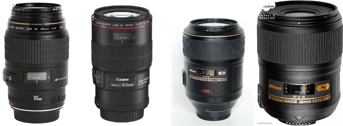 니콘에서 출시되는 60mm와 105mm는 각각 두 종류의 렌즈가 있다. 현재 출시되는 105mm는AF-S VR Micro Nikkor ED 105mm f/2.8G(IF)이며, 60mm는 AF-S Micro NIKKOR 60mm f/2.8G ED이다. AF Micro Nikkor 60mm f/2.8D는 60mm의 구형 모델인데 현재 거래가 활발히 이루어지는 모델은 아니다. 니콘에서는 과거의 모델에서 최신 모델로 발전하면서 화질과 편의성을 위해 몇 가지를 개선하였다. 최신 출시된 렌즈 중에는 렌즈의 이름에 ED라는 말을 쓰는 경우가 있다. Extra low Dispersion의 약자로서 분산율을 적게 하여 색수차를 최대한 줄인 렌즈이다. 그리고 위에서 설명한 모델에서 AF는 auto focus 기능이 가능하다는 말이며, S는 초저소음 렌즈라는 뜻이며, VR은 손 떨림 줄임 혹은 방지기능을 말하는 것이다. 그리고 AF는 자동 포커스 렌즈이나 구동을 카메라에서 하며, 렌즈에는 따로 구동 모터가 없는 것을 말한다. 그리고 AF-S는 구동을 렌즈에서 하되 초저소음으로 구동한다는 뜻이다. 105mm VR 렌즈의 경우 끝에 IF라는 말이 붙어있는데 그것은 internal focusing이라는 말의 준말이며 렌즈 경통의 길이가 움직이지 않고 내부에서 포커싱한다는 뜻이다. 캐논은 접사촬영 시 주로 100mm를 쓰게 되는데 두 가지 종류가 출시되고 있다. EF 100mm f/2.8L Macro IS USM와 EF 100mm f/2.8 Macro USM 두 가지이다. EF라는 말은 니콘의 AF와 같은 말로 쓰이는데 electro focusing을 뜻하며 L은 Luxury(고급) 렌즈이며, 비구면 렌즈와 저 분산 렌즈를 채택하여 일반 렌즈와 차별화했다는 뜻으로써 일반적으로는 고가의 렌즈들이다. IS는 Image stabilizer로 니콘의 VR과 같은 뜻으로 쓰인다. USM은 초저소음 렌즈구동을 뜻한다. 특징적인 것은 같은 스펙트럼이라도 니콘은 Micro라는 말을 썼고 캐논은 Macro라는 말을 렌즈에 붙였다. 몇 가지 관점에서 60mm와 105mm(혹은 100mm)를 비교 해보도록 하겠다