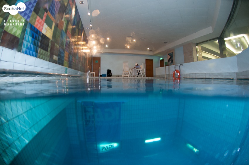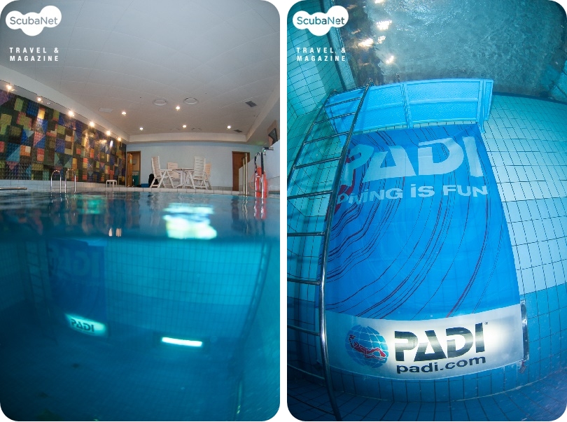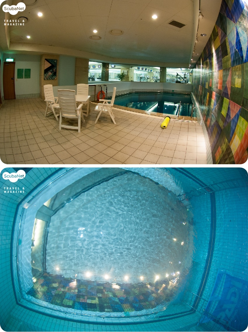 반수면으로 촬영 한 풀장의 모습과 바닥까지 연결 된 사다리와  대형 PADI 플래그