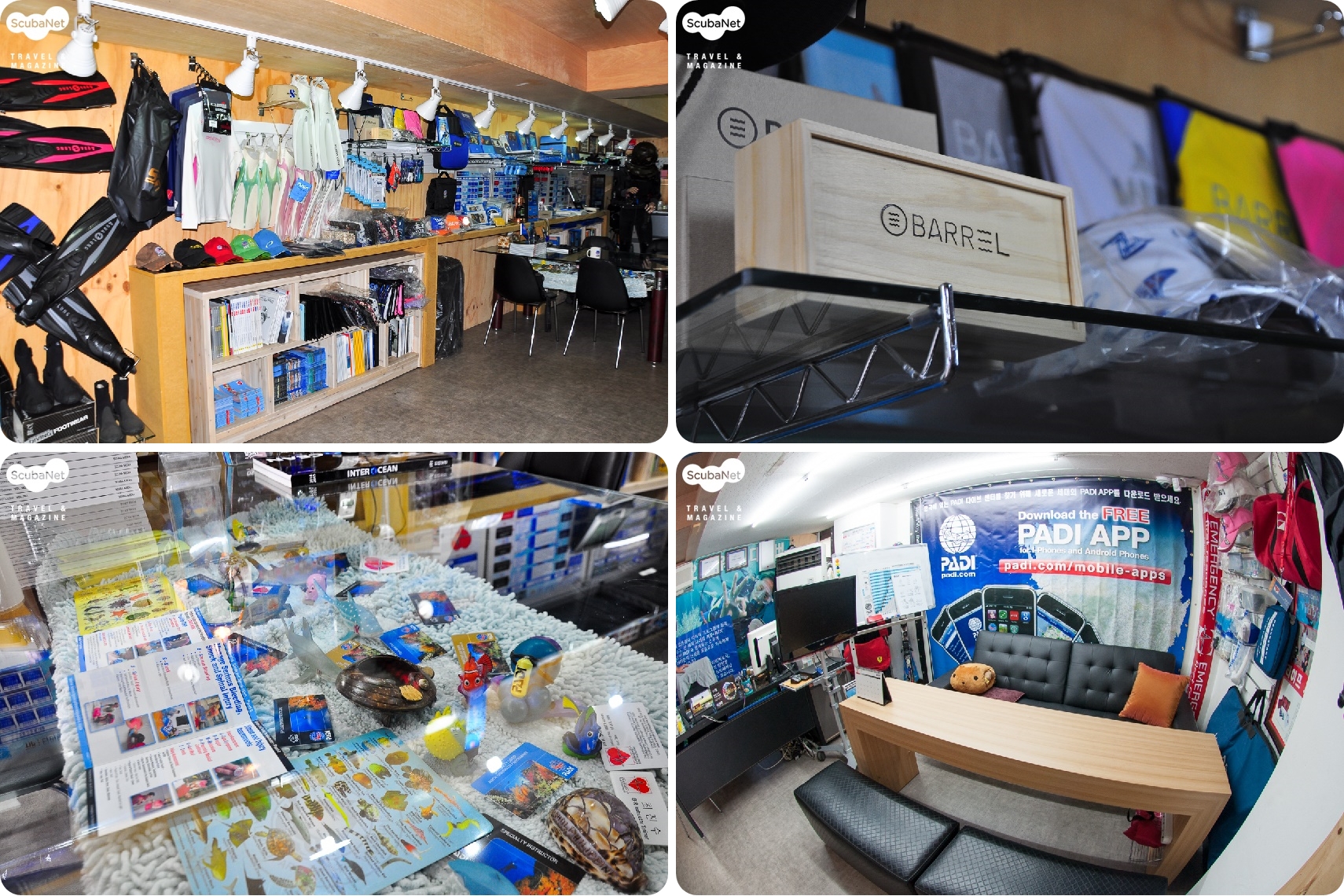 숍 내부는 왼쪽으로는 장비와 교재가 예쁘게 전시되어 있고, 오른쪽은 교육을 위한 책상과 칠판이 마련되어 있다. 상담을 위한 유리 테이블 안에는 귀여운 물고기 피겨들이 가득 들어있어 당장이라도 물속으로 들어가고픈 기분이 들게 한다. 한쪽에는 배럴 제품들이 전시되어 있다. 서퍼들에게 잇브랜드인 배럴은 합리적인 가격과 세련된 디자인으로 최근 다이버들에게도 큰 사랑을 받고 있다. 래쉬가드, 보드숏, 레깅스 등의 의류와 선그라스, 모자, 웨이스트 백 등을 판매하고 있다. 다이버들에게는 특별 할인 혜택도 있다고 하니 배럴 제품에 관심이 있는 다이버라면 돌피노 다이버스를 방문해볼 일이다.