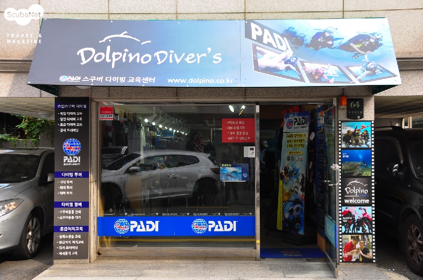 JW 메리어트 호텔 다이빙 풀을 위탁 운영하고 있는 돌피노 다이버스는 서초구 방배본동에 위치한 PADI 다이빙 전문교육센터로 PADI Master Instructor인 최진수 강사가 운영하는 곳이다. 입구에서부터 깔끔하고 아기자기한 인테리어가 눈길을 사로잡는다. 실제로 지나가다가 숍에 들러 교육 문의를 하고 다이버가 되는 사람들도 많다고 한다.
