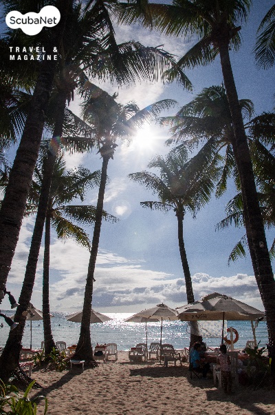 매력 포인트 1. 말이 필요 없는 한 폭의 그림, 화이트 비치보라카이의 화이트 비치는 어디에 눈길을 두어야 할지 고민이 될 정도로 보이는 모든 곳이 아름다운 곳이다. 에메랄드 빛이라는 한 가지 말로는 표현이 되지 않는 다양한 색상의 투명한 바다와 그 위를 미끄러지는 시원한 파란색의 돛단배, 눈부시게 하얀 모래사장과 원색의 파라솔, 시원한 그늘을 만드는 야자수, 내리쬐는 강렬한 태양. 그 모든 것이 어우러진 풍경은 한참을 보고 또 봐도 질리지 않는다. 눈을 감아도 생생히 그려질 정도로 모든 것을 눈에 담아두고 싶어진다. 필자가 그 동안 가본 여러 다이빙 사이트 중 해변의 아름다움으로는 무조건 으뜸인 곳이다. 아름다운 해변은 보는 것만으로도 기분이 좋아지고 모든 스트레스와 피로가 날아가는 힐링 그 자체였다.