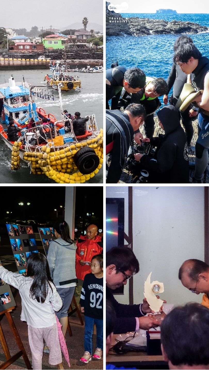 멘토심사 : 멘토들의 오늘의 수중사진 심사 장면 11월 2일: 다양한 시상과 즐거운 축제의 시간일어나니 어제와 다르게 맑은 날씨가 축제 참가자들은 반겨줬다. 들뜬 마음으로 다들 지정 촬영지로 향했고 다이빙 일정은 이날도 전날과 같은 방식으로 진행됐다. 서로 친분도 쌓이고 날씨까지 좋아서 이날 다이빙은 더욱 즐겁게 이뤄졌고 다이빙 후 서로 자기 사진을 보여주면서 선택한 각자의 "오늘의 수중사진"과 “PDF 사진”이 주최 측에 제출되었다. 각 참가자의 사진은 소형 인화를 거처 인근 대형 마트 앞에 전시되어 지나가는 비 다이버 일반인에게 투표로 평가받았고, 저녁 식사 후 다 같이 모인 자리에서 최종 시상식이 이뤄졌다. 대상, 금상, 은상, 동상뿐만이 아니라 그린포토그라퍼상, 최우수 멘토상, 행운상과 각 참여 리조트들의 협찬 이용권까지 나누어지면서 많은 참가자가 기쁨과 행운을 누렸다. 마지막으로 참가자들의 감사와 애정의 표시로 주최하고 수고해 준 방 대표의 수영장 입수식까지 가졌고 제주 수중사진 연구회 양 회장과 캠스퀘어에서 준비한 대형 부시리 회와 제주 통돼지 바비큐로 단체 뒤풀이가 늦은 시간까지 이어져 가면서 이번 축제는 훈훈하게 마무리되었다.