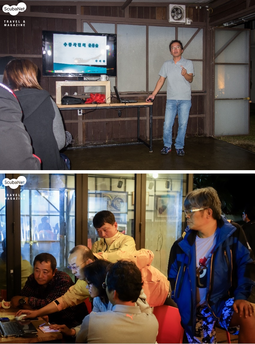 11월 1일: 수중과 지상에서 진행된 멘토링그 전날 즐거운 축제 분위기에 안 맞게 다음날 일어나니 날씨가 흐렸다. 비도 오고 바다에는 너울까지 있어서 다이빙은 다소 힘들었지만 그럼에도 불구하고 다들 꿋꿋하게 이른 아침서부터 부지런히 준비하고 바다로 향했다. 멘토와 소규모팀으로 이루어진 스케줄은 참 많은 장점을 가지고 왔다. 식사서부터 다이빙, 이동과 휴식시간을 조별로 하다 보니 멘토에게 참 많은 주옥 같은 경험담과 조언들을 들을 수 있었고 더 나아가서 같은 취미를 가진 사람끼리 종일 있다 보니 모두가 금세 친해졌다. 물속에서도 멘토는 적극적으로 거의 1:1 수중 멘토링을 해줬고 조원들끼리도 서로 협력하고 배려하면서 보람찬 다이빙이 할 수 있어서 참 훈훈했다. 다이빙을 마치고 리조트로 돌아와서는 조별로 모여서 같은 날 찍은 사진을 공유하고 멘토의 조언을 듣는 시간을 가질 수 있었다. 그날 밤 저녁 식사를 마치고 다들 한자리에 다시 모여서 김기준 멘토의 “수중사진 운용술” 세미나를 들을 수 있었고 그 후에 각 참석자가 제출한 사진들을 같이 감상하고 멘토들이 심사한 "오늘의 수중사진" 시상식이 이루어졌다. 단체 모임 후 자연스럽게 이어진 조별 뒤풀이로 이날 밤은 막을 내렸다.
