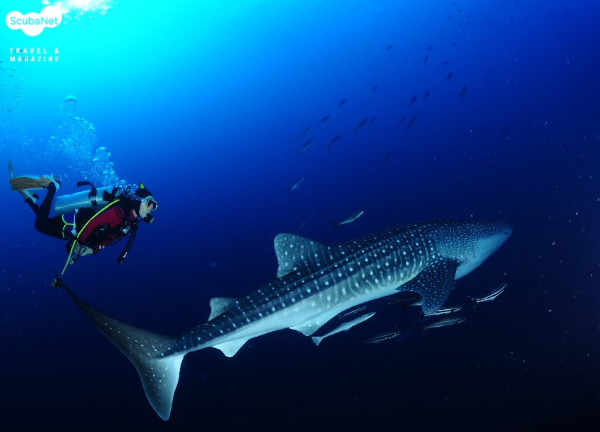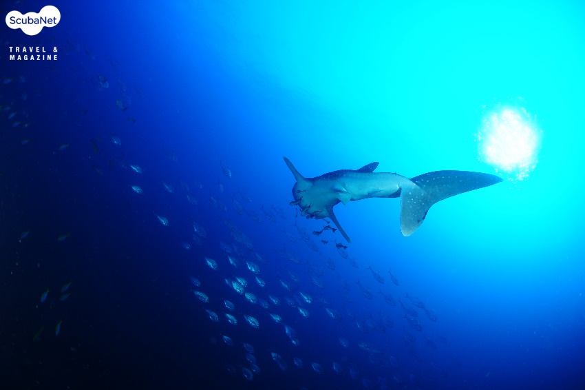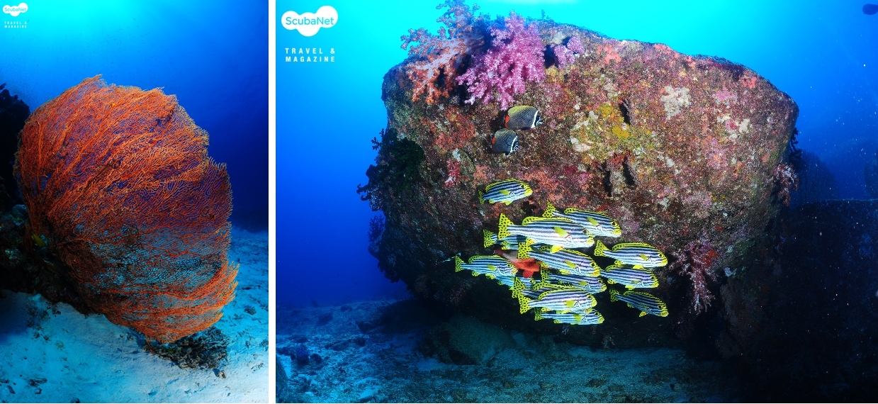 세 번째 날 3.1절 아침, 지난 이틀간의 다이빙에서 대물을 보지 못한 우리는 만타와 고래상어를 자석처럼 끌어당긴다는 Chada 강사님의 브리핑을 귓전으로 흘리며 이 날 첫 다이빙을 Torilla point에서 테스트 다이빙처럼 시작했다. 다른 팀원들이 스팅레이와 마크로 생물들을 구경하는 동안 광각을 세팅해서 들어간 나는 팀원들 뒤를 천천히 뒤쳐져 가고 있는데 마스터 Nuek이 하늘을 가르키는 거다. 그런데, 그런데! 머리 위를 우아하게 지나가는 검은 그림자. 그렇다 고래상어님 되시겠다. 나머지 그룹은 보지 못하고 계속 진행하고 뒤 쳐져 있던 다이버 그룹들과 함께 고래상어를 따라 붙었다. 고래상어를 따라 가는 중 실버팁 샤크도 발견했지만 덩치에서 밀리는 관계로 무시당하고, 고래상어와 다이버들이 약 20분 이상을 같이 천천히 유영했던 것 같다. 고래상어의 감동을 뒤로하고 옐로우 스내퍼로 유명한 시밀란 최북단의 Richelieu rock으로 이동하여 두 번의 다이빙을 하면서 엄청난 무리의 옐로우 스내퍼 떼와 할리퀸 새우 등을 관찰 할 수 있었다.