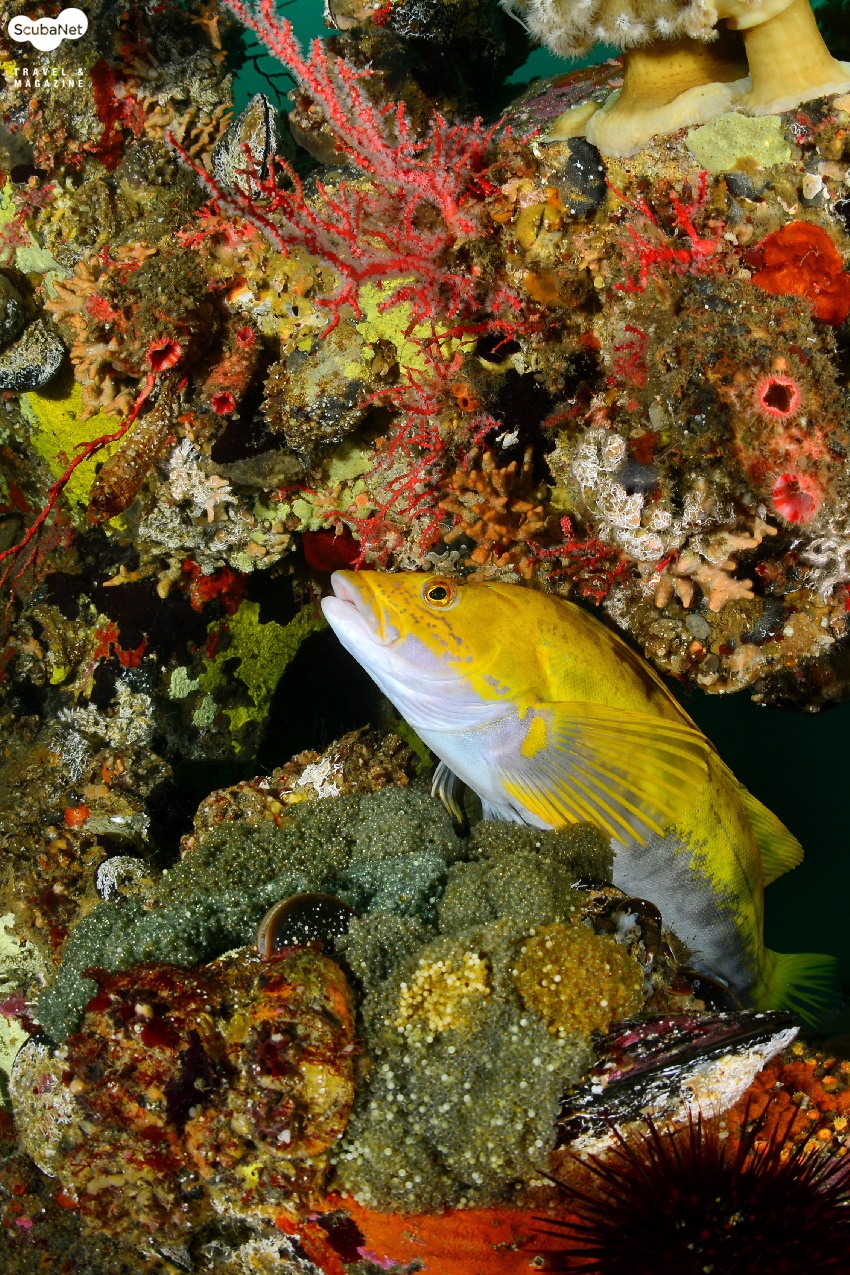 나 홀로 입수하여 모처럼 10m 이상 보이는 맑은 바다 속을말없이 싸돌아 다녀봤네요. 오늘 아침 기준 수온 14℃에 여기저기에 산란철을 맞은 쥐노래미들의 알 무더기가 보이고 혼인색을 노랗게 물들인 수컷은 내게 눈알을 부라립니다.