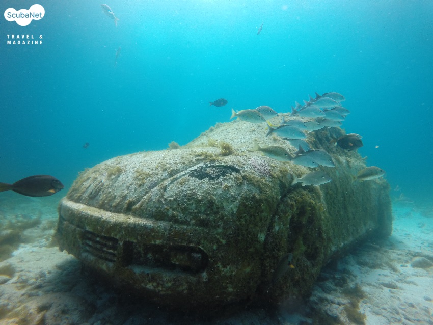 필자가 다이빙을 한 포인트는 칸쿤 해역에서 조금 배를 타고 나가다 보면 Isla de Mujeres(영어로 Island of Mother, 어머니의 섬)를 만날 수 있는데, 이 곳 해역에 조성된 수중박물관 포인트였다. 두근두근 드디어 꿈에 그리던 곳에서 다이빙을 한다는 사실에 흥분이 되었다. 풍덩! 입수를 하자마자 바닥에 무언가 둥그스름한 물체가 보인다. 가까이 가보니 콘크리트로 만든 폭스바겐의 비틀 자동차였다. 물 속에 자동차라니! 내부는 어떨까 하고 안을 들여다 보았는데, 와우! 내부는 단순히 빈 공간이었다. 그런데 이 속에 물고기들이 각양각색으로 바글바글! 바로 물고기 쉼터로 활용되는 것이었다. 폼 나는 자동차를 뒤로하고 조금 이동하니 콘크리트 집과 석탑 같이 생긴 작품들도 눈에 띄었다. 구석구석 살펴보니 갑각류나 문어, 뱀장어 같이 생긴 곰치 등이 다들 제자리를 하나씩 차지하고 있었다. 그리고 멀지 않은 곳에는 우스꽝스럽게 생긴 조각상이 눈길을 끌었다. 세 사람이 머리를 땅에 처박고 있는 듯한 작품이었는데, 물고기들도 웃기게 생긴 조각상이 좋은지 꽤 많은 무리를 이루면서 이곳 주변을 빙빙 돌고 있었다.