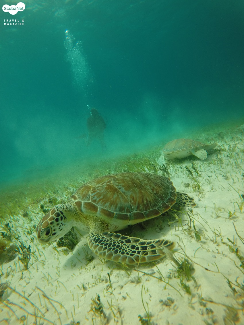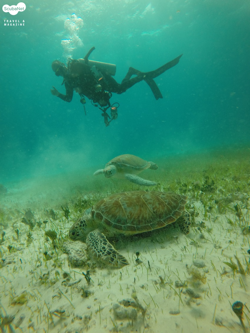마지막 다이빙 포인트에서 출수를 앞두고 다이브 마스터의 안내로 거북이들이 좋아하는 터틀 그래스(Turtle grass)가 자라는 지역을 방문했는데, 이게 왠걸 과연 거북이(종류는 그린 터틀, Green Turtle) 한 마리가 정신 없이 풀을 뜯고 있었다. 이 녀석은 주변에 다이버가 가까이 가든 말든 신경도 쓰지 않고 주린 배를 채우느라 정신이 없는 듯했다. 보통 목장의 소들이 풀을 뜯는 광경을 떠 올려 보면 느긋한 평화로움을 떠올릴 수 있겠지만, 얼마나 배가 고팠는지 느림보 거북이가 아닌 닌자 거북이와 같은 속도로 미친 듯이 풀을 뜯는 모습에 자꾸만 웃음이 나왔다. 한참을 관찰하고 있노라니, 다이브 마스터가 신호를 보낸다. 무슨 일인가 했더니, 어이쿠! 거북이 한 마리가 더 합류를 하였다. 두 놈이 정신 없이 풀을 뜯는데, 덕분에 좋은 사진 모델이 되었다. 색깔도 조금 다른 것이 저마다의 개성이 있는 녀석들이었지만 식성과 식욕은 동일한 듯 하다. ^_^. 실컷 사진을 담고 이제 출수할 시간이다!