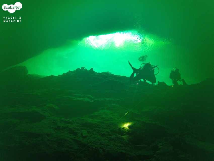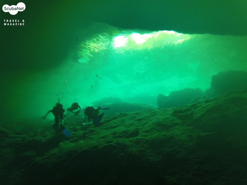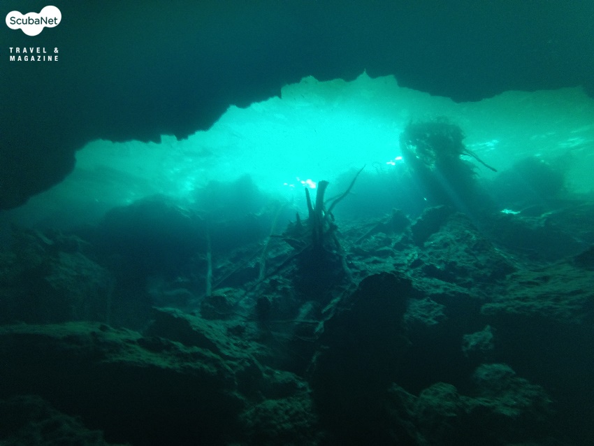 입수하는 곳은 작은 웅덩이를 연상시켰는데 민물이라서 그런지 이끼가 많아서 제법 미끄러웠다. 그리고 많지는 않았지만 민물고기들이 눈 앞에서 조금씩 돌아다닌 것이 보였는데, 석회질이 많은 물 속이라 살기 힘들 줄 알았지만 그래도 서식환경으로는 나쁘지는 않은 듯 했다. 다이브 마스터의 안내를 받으면서 잠수를 시작했는데, 어두컴컴한 것이 한치 앞을 분간하기 어려웠는데 영화에서 무시무시한 괴물이 덮치기 직전 장면이 떠올라 긴장되었다. 한 50m 정도 진행했을까? 뒤를 슬쩍 돌아보았는데, 아! 말로는 표현하기 힘든 떨림이 몸을 훑고 지나갔다. 동굴입구 틈 사이로 새어 들어오는 빛 줄기는 에메랄드 색으로 영롱하였고, 바닥에 아무렇게나 쌓여있는 죽은 나무들이나 돌덩어리들이 기이한 세계의 입구를 연상시켰다. 이 모든 광경이 한 눈에 들어오는 것은 분명 끝도 없는 청명한 수중시야 때문이었다.