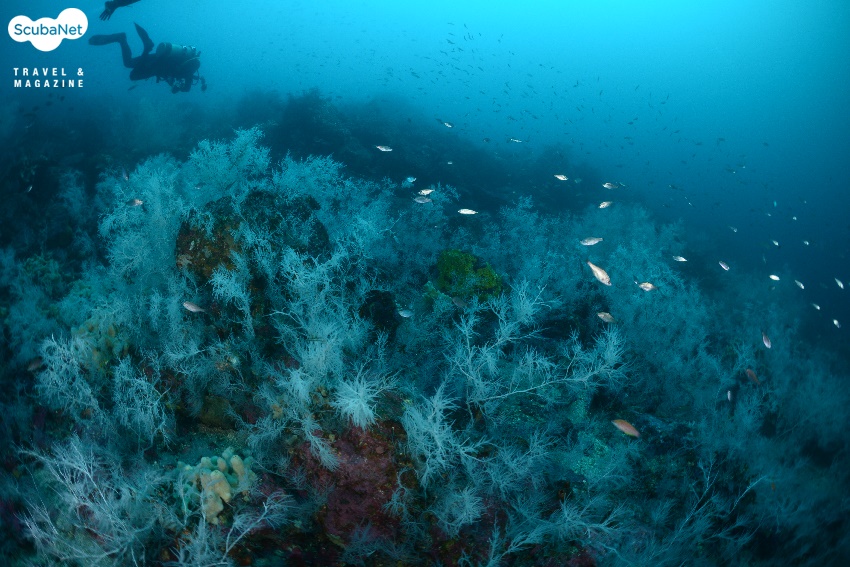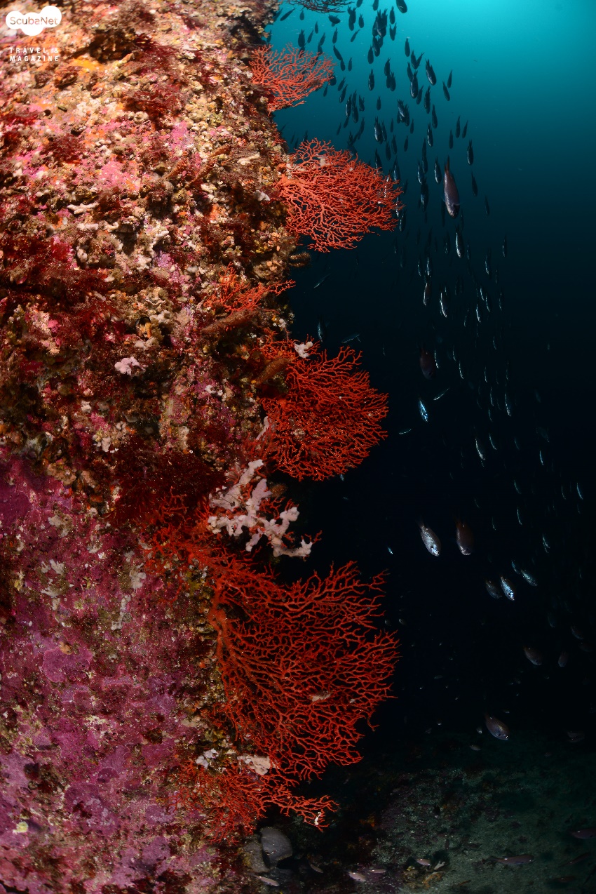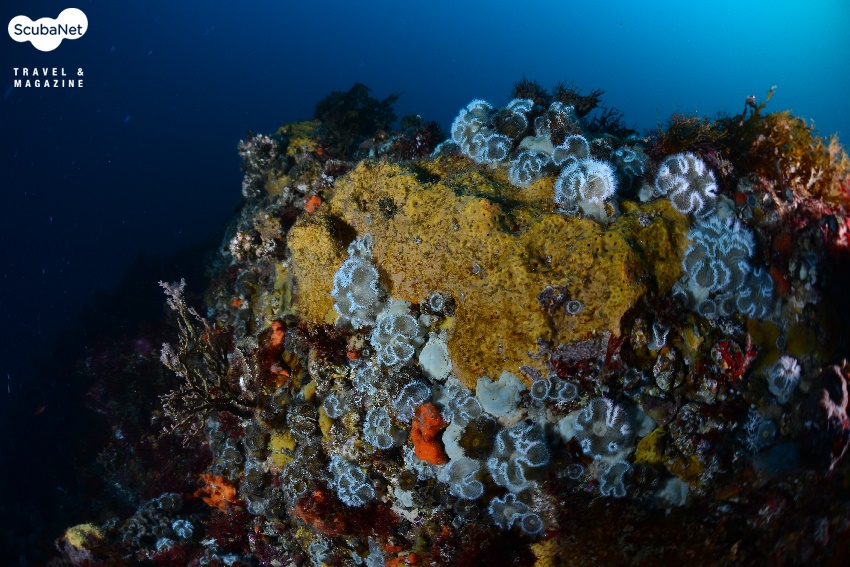 바위 중간중간에 오버행들이 있어서 그 아래 여러 가지 부착생물들이 있는데 그 중에서 멸종위기종 2급으로 지정된 유착나무돌산호 군락도 있었다. 유착나무돌산호는 남해안 다이빙에서 가끔 보였지만 이렇게 여러 그루가 모여있는 군체는 북저바위에서 처음 만났다. 잘 보존되어 다른 다이버들도 북저바위에서 이들을 구경할 수 있기를 바란다.