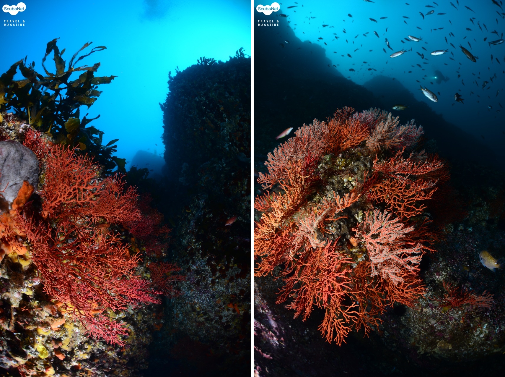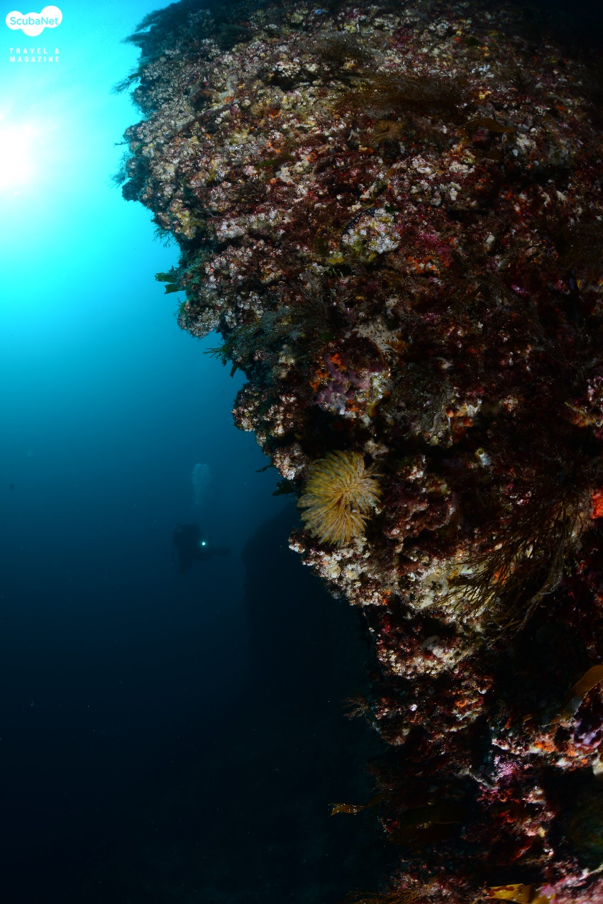 울릉도에서는 본섬에서 입수해도 수심이 보통 20m~30m 이상 깊어지는 경우가 많은데 이곳도 역시 절벽을 타고 내려가다 보니 바닥에 닿지도 않았는데 수심이 벌써 30m에 가까워졌다. 바로 하강을 멈추고 절벽을 따라 옆으로 이동했다. 이곳에서 가지가 휘어진 울릉도해송 한그루를 만나서 촬영을 하는데 마침 동행한 정상근 교수님이 모델을 자처해 좋은 사진을 건질 수 있었다.