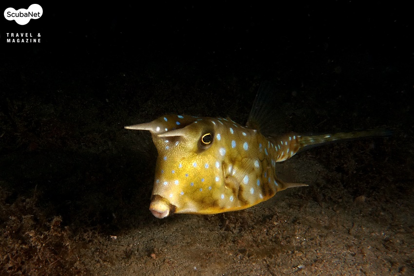 슬로프 위를 헤엄치는 카우피시를 배경을 어둡게 촬영하기 위하여 조리개를 조이고 셔터스피트는 빠르게 촬영한 사진. 스트로브