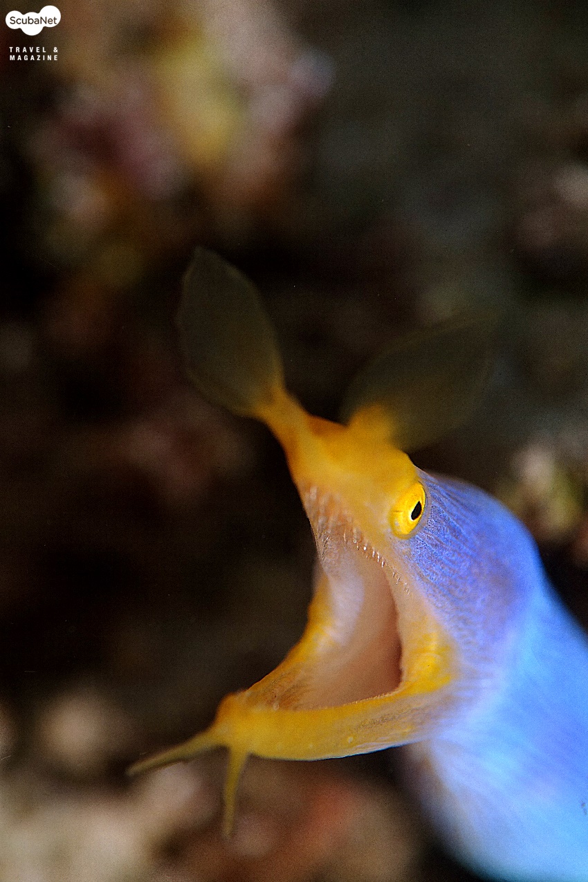 블루리본일은 산호초 바닥의 구멍에서 머리를 내놓고 있어, 뒷배경 처리 가 애매한 경우가 많다. 심도를 얕게 촬영하기 위하여 리본일에 최대한 접근하여 촬영한 사진. Anilao, Philippines. Canon 100, Patima housing, Inon S2000, M mode, AWB, f7.1, 1/200s, ISO 100