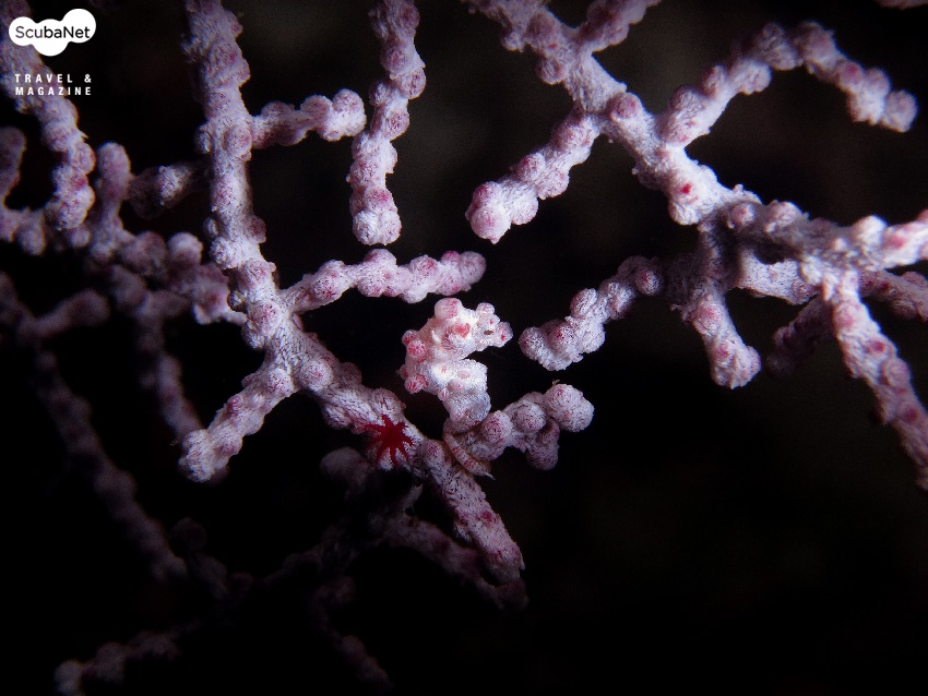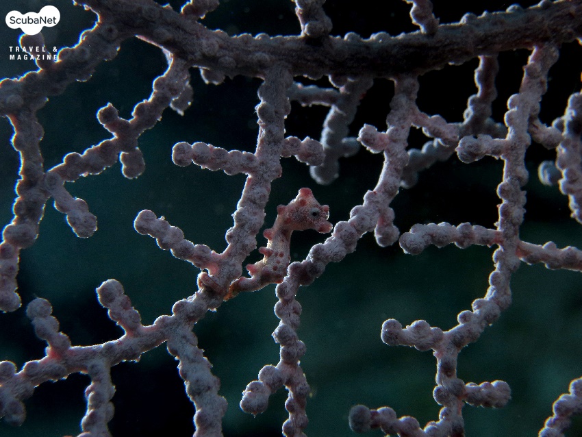 배경접사사진에 있어 배경은 무엇을 말하는 것일까요? 모든 피사체는 서식하는 환경이 있으며, 그 것이 배경이 됩니다. 부채산호에 서식하는 피그미해마는 부채산호의 줄기를 꼬리로 감고 폴립들 사이에 숨어서 흔들거리고 있습니다.