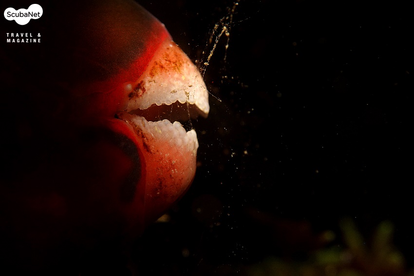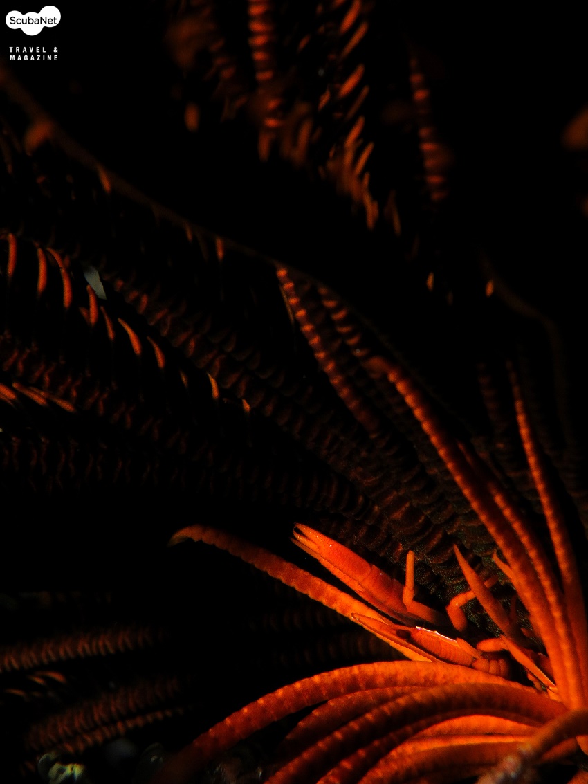 야간다이빙시, 산호 위에서 활짝 피어있는 붉은 바다나리 기단부에 공생하는 스쿼트 랍스터를 촬영하기 위하여, 배경은 검게 처리하고, 최소의 스트로브 광량으로 피사체만 부분적으로 표현한 사진. Komodo, Indonesia. Canon S100, Patima housing, Inon 165+330