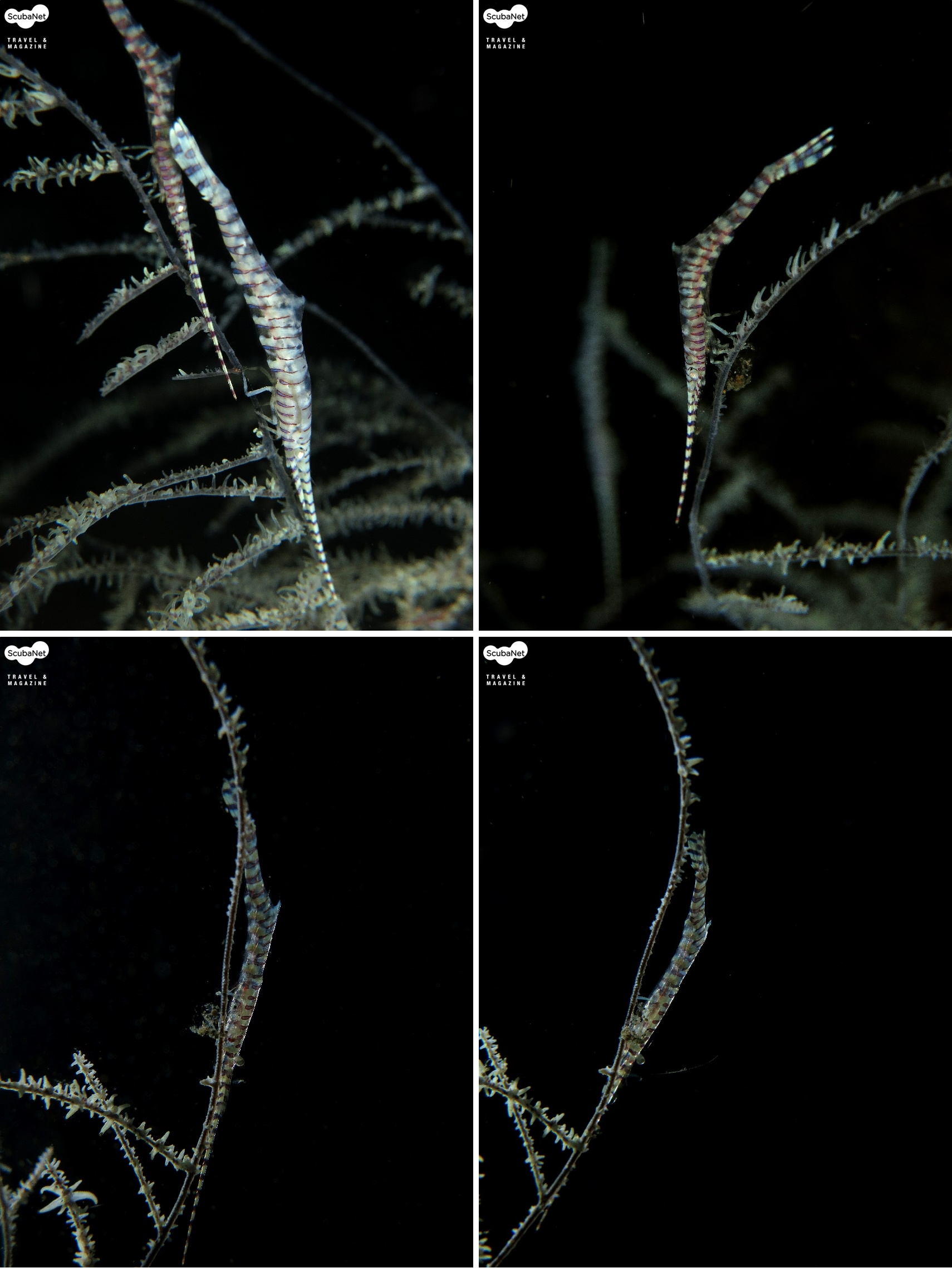 1~4 먹다이빙(Mug diving) 지역에 있는작은 해송에 서식하는 톱날새우를 부각시키기 위하여, 셔터스피드를 빠르게 설정하여 배경을 검게 처리한 사진. 역광의 효과를 더하기 위하여 스트로 브 하나를 뒤에 설치하여 광동조로 발광시켜 주광으로 활용하 고, 전면의 스트로브는 최대한 약하게 발광시켰다. 해송과 톱 날새우로 검은 화면을 어떻게 분할하는가가 중요하다. Anilao, Philippines. Canon S100, Patima housing, Sub-Sea +10 / Inon 165 Micro conversion lens, Sea&Sea YS-110, Inon S2000 strobe, M mode, AWB, f8, 1/500s, 1/60s,1/200s,