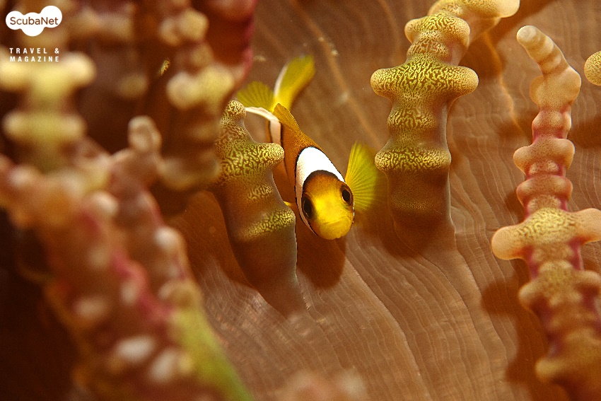 말미잘에 공생하는 아네모네 피시를 말미잘의 무늬를 배경으로 살려 촬영한 사진.