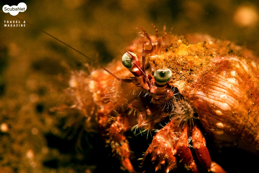 소라를 뒤집어쓰고 있는 집게의 눈에 초점을 맞춰 촬영한 사진. 조리개를 열고, 최소초점거리에 근접하여 촬영 하여 심도를 얕게 하였다. Milen bay, Papua New Guinea. Sony RX100, Patima housing, Inon 165 Micro conversion lens, Sea&Sea YS-D1, M mode, AWB, f5.6, 1/500s, ISO 100