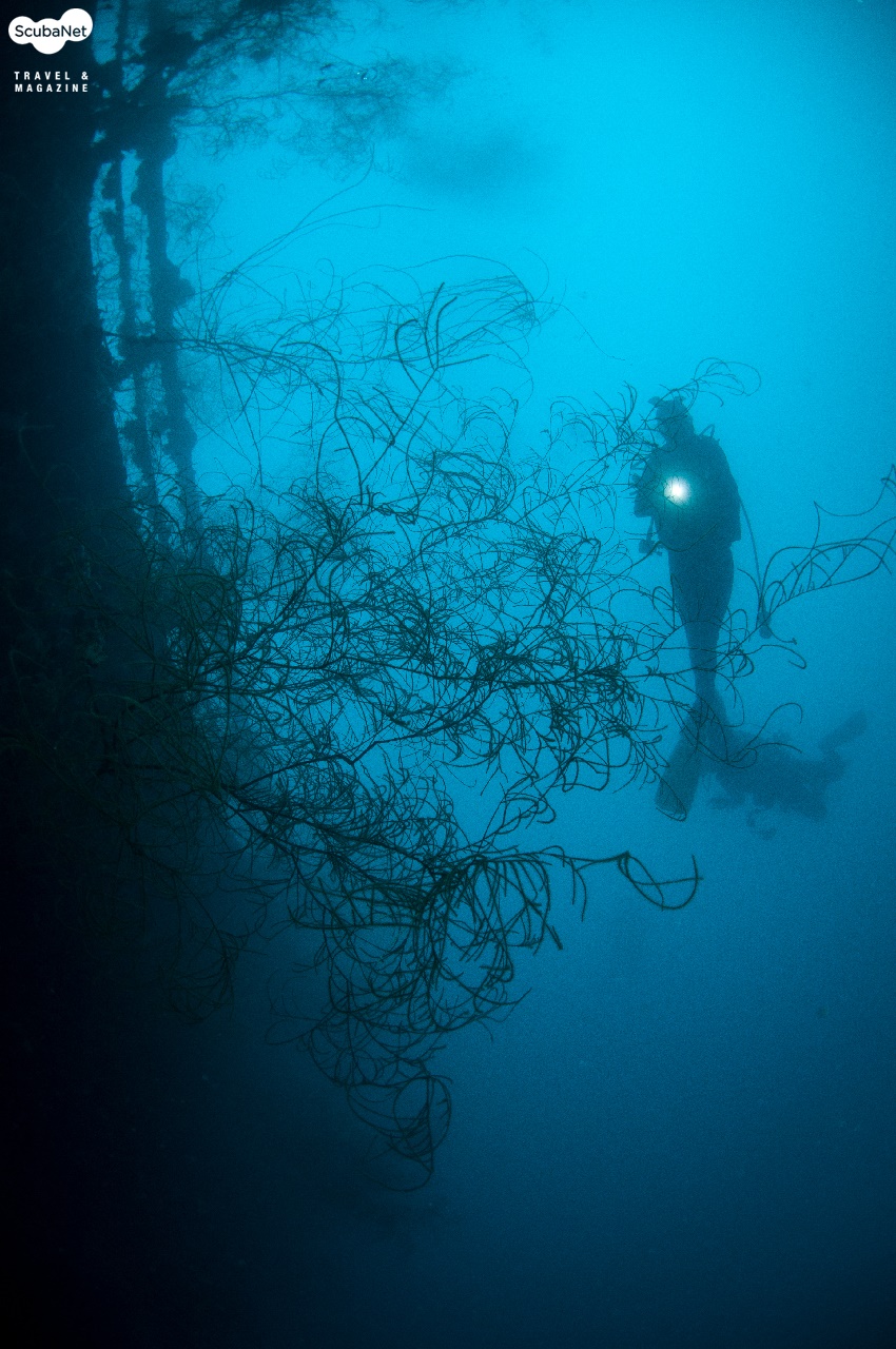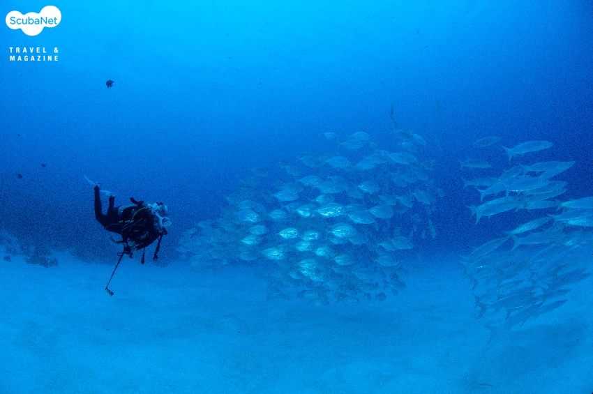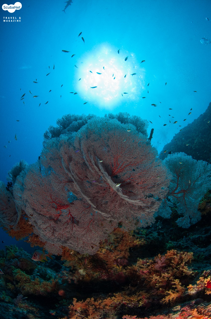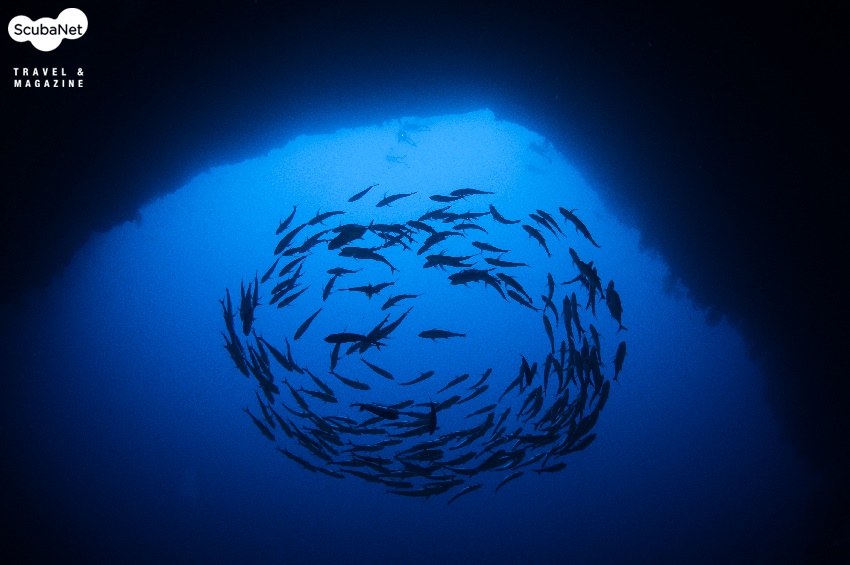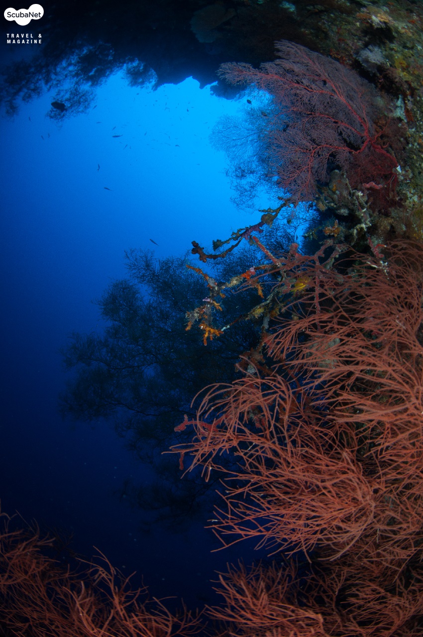 깊은 수심 때문일까, 그로 인해 빛이 적기 때문일까? 시에스 터널에서는 잭피시의 움직임 마저 정적으로 보인다. 터널 안으로 들어가면 두 개의 출구가 눈에 들어오는데 왼쪽 출구가 훨씬 크다. 터널 안에도 부채 산호가 가득하다. 멀리 보이는 터널 입구의 파란 바다와 붉은 부채산호의 강렬한 대비가 너무도 멋지다. 깊은 바다의 진한 물색이 아름다우면서도 그 때문에 머물 수 있는 시간이 짧은 것이 아쉽게 느껴지곤 한다.