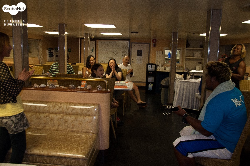 세 번째 이유, 최고의 멤버친절하고 재미있는, 최고의 스태프앞서 말했듯 팔라우 스포츠의 사장은 일본 여성이다. 일본인 특유의 친절함에 여성의 섬세함으로 싹싹하고 나긋나긋하게 고객의 필요를 모두 맞춰주려 애쓴다. 사장이 이렇다 보니 스태프들도 고객의 만족을 최우선으로 여긴다. 스태프들은 주로 팔라우 현지인들인데 낙천적이고 유쾌한 성격을 타고난 사람들이라 선상의 분위기는 더욱 즐거울 수 밖에 없다. 체계적이고 친절하고 고객을 왕으로 생각하는 일본인 사장과 항상 쾌활하고 재미있는데다 예술적인 감각까지 있는 팔라우 현지 스태프들의 조화! 기념일을 맞은 다이버에게 가이드들이 직접 티셔츠에 물고기를 그리고 글씨를 적어 선물해주기도 하고 기타 연주와 노래로 분위기를 살리기도 했다. 팔라우 스포츠 스태프들에 대한 만족도는 단연 최고였다.