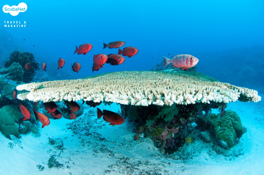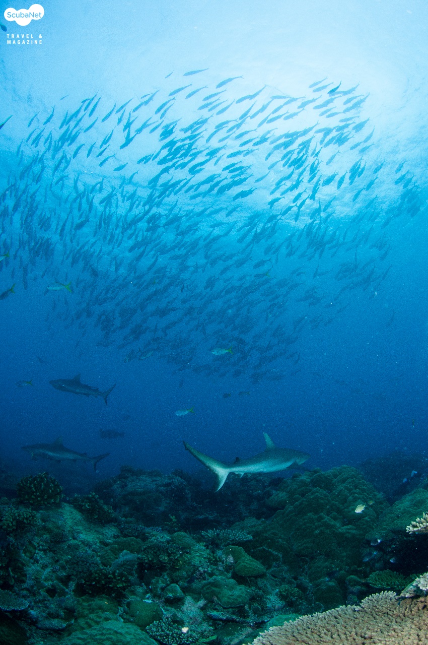 울롱 월, 상어들의 아침식사예상 외로 조류가 전혀 없어 편안하고 평화롭게 진행된 다이빙이었다. 테이블 산호가 끝없이 펼쳐진 아름다운 풍경을 감상하는데 갑자기 가이드들의 눈치가 심상치 않았다.