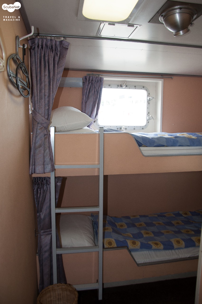 팔라우 스포츠의 배는 멋지거나 럭셔리한 배와는 다소 거리가 있다. 하지만 필자가 그 동안 이용해본 그 어떤 배보다 실용적이고 효율적인 구성을 갖췄다. 그리고 정말 깔끔했다. 배는 1, 2, 3층과 지하로 구성되어 있는데 1층에는 식당과 라운지, 다이빙을 준비하는 곳이 있다. 2층에 선장실과 객실, 다이빙 브리핑을 하는 오픈된 공간이 있고 3층에는 선베드가 놓여 있다. 지하는 엔진 등이 있는 기계실이다. 식당과 라운지를 겸한 공간에는 넓은 식탁이 놓여있어 식사를 마친 후에 컴퓨터로 사진을 정리하거나 로그북을 쓰기에 편안했다. 소파 옆에는 커다란 TV가 있어 함께 사진을 보기에 좋았고 틈틈이 낮잠을 자기 좋은 소파가 놓여있다. 다이빙 준비를 하는 선미의 wet zone에는 4줄로 장비가 도열해 있다. 다이버들에게는 1인당 두 개의 공기탱크와 나무 박스가 할당되는데 나무 박스 안에 장비를 넣어두면 스태프들이 다이빙 전에 스피드 보트로 장비를 옮겨준다. 카메라와 장비를 세척하는 물통도 넉넉히 준비되어 있고 젖은 카메라를 올려놓을 수 있는 선반도 있다. 팔라우 스포츠는 무엇보다 장비 건조에 많은 신경을 쓴 티가 났다. 옷걸이와 빨래집게가 넉넉히 준비되어 있고 부츠를 꽂아서 말릴 수 있는 나무 벤치가 놓여 있었다. 그리고 무엇보다 탈수기가 있었다! 탈수기의 존재가 이렇게 유용할 줄이야!! 하루 4번의 다이빙을 두 벌의 수영복으로 번갈아 한다고 해도 매번 바싹 마른 수영복을 입기란 어려운데 탈수기 덕에 매번 보송보송한 수영복을 입을 수 있었다. 슈트도 탈수기로 돌려서 널어두면 다음 다이빙에 입을 때 한결 쾌적했다. 객실은 2인실과 4인실이 있는데 2명, 4명이 함께 쓰기에 다소 좁은 편이지만 낮 시간의 대부분은 1층과 3층에서 보내기 때문에 크게 불편하지 않다. 객실에는 선반과 바구니 등 수납공간이 잘 갖춰져 있고 침대에 커튼과 개인 전등이 있어 혼자만의 아늑한 공간이 된다.