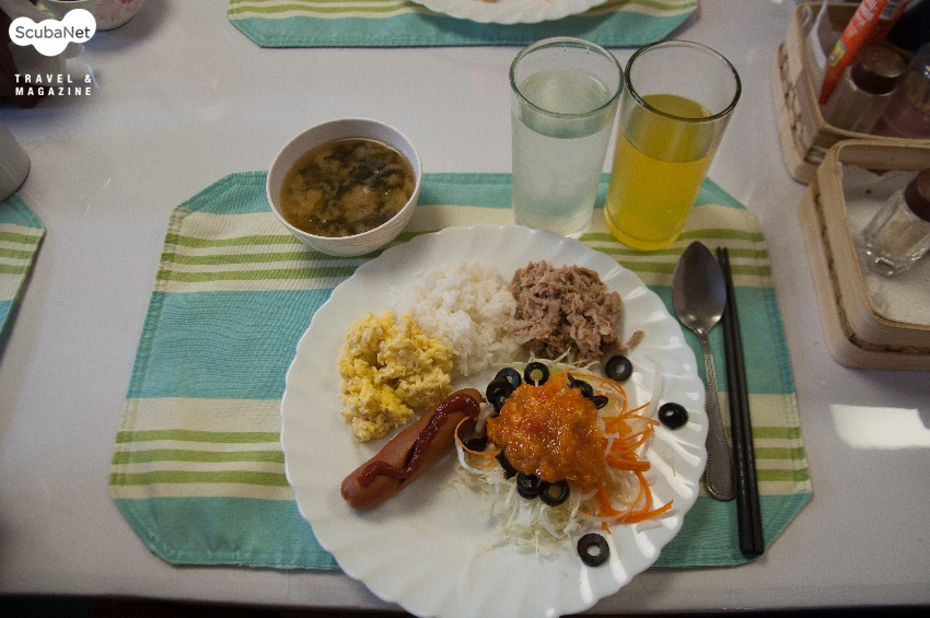 맛있는 식사!팔라우 스포츠는 주인이 일본 여성인 키미코 리시모토 씨다. 일본 다이버들이 주 고객층인만큼 음식은 주로 일본식이다. 아침과 저녁은 밥과 국, 반찬이 나오고 점심은 스파게티나 우동 같은 면 요리가 나온다. 음식은 단 한 가지도 실망한 적이 없다. 아니 모두 정말 맛있었다. 저녁에는 달콤한 디저트가 나오는데 정말 한국의 웬만한 카페에서 먹는 것보다 맛이 좋았다. 준비해간 부식이 대부분 남았을 만큼 식사에 대한 만족도는 모두에게 매우 높았다. 밤에는 스태프들이 배 뒤에서 낚시를 하기도 하는데 이 때 잡은 물고기는 다음날 맛있는 음식이 되어 올라오곤 했다. 덕분에 쫄깃쫄깃 고소한 생선구이와 그야말로 신선한 회를 맛볼 수 있었다.