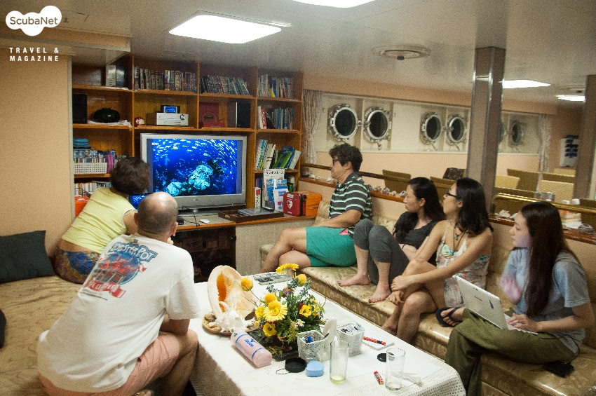 라운지에서 함께 수중사진을 감상하는 다이버들