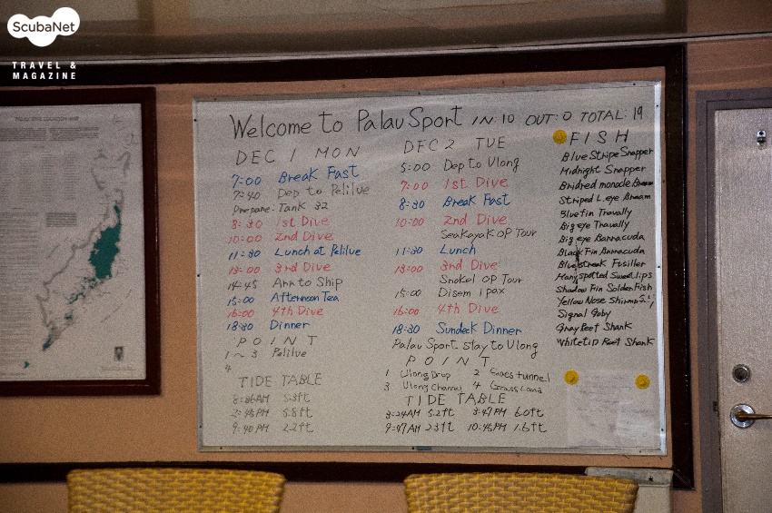 식당의 화이트보드에는 그날의 스케줄과 다이빙 포인트, 볼 수 있는 어종이 적혀있다. 페렐리우를 가는 날의 일정.