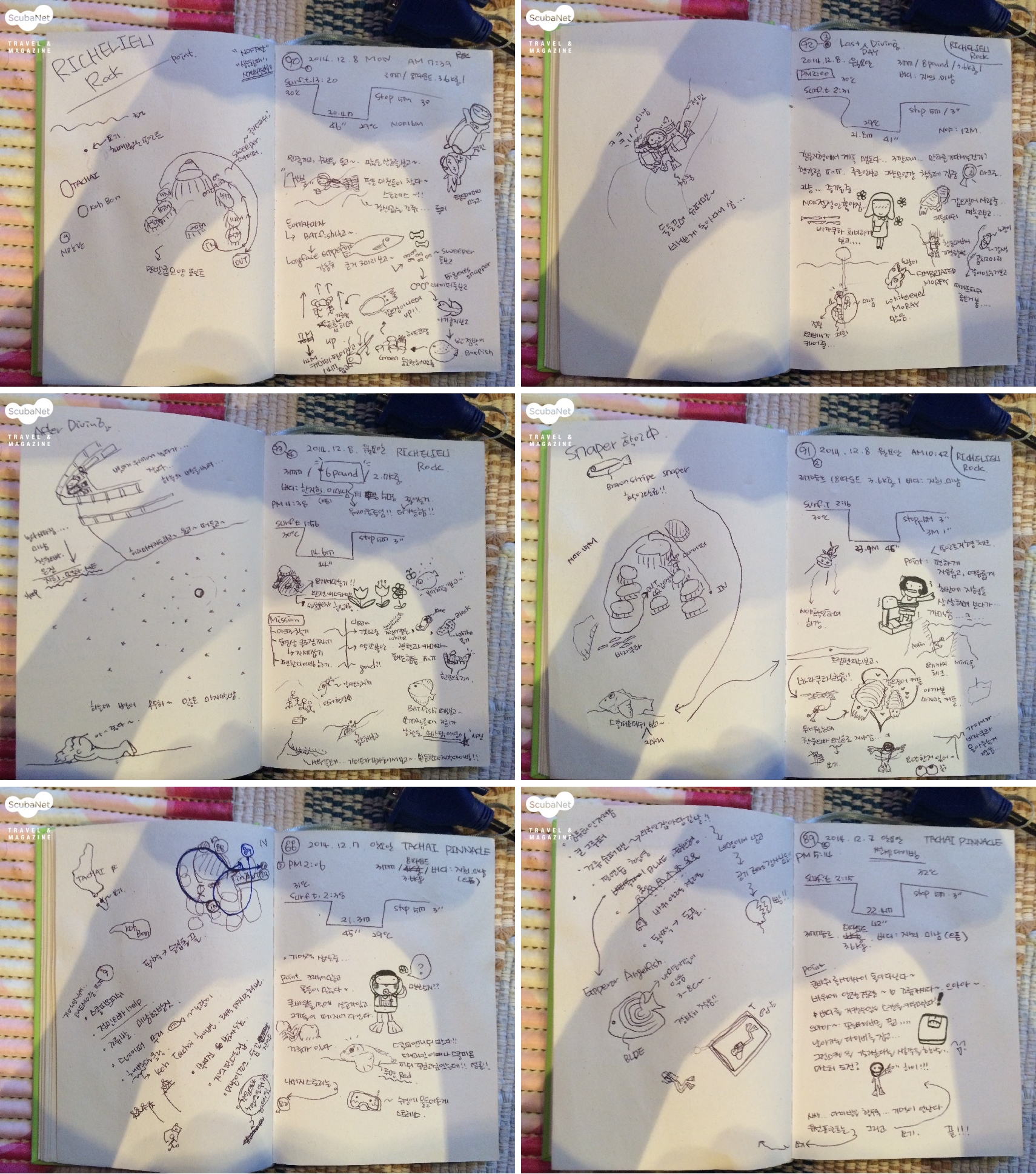 여기서는 투어에 참가하여 함께 다이빙을 했던 김아영 양이 그림과 함께 기록한 로그북과 전찬웅 강사의 사진들을 소개하기로 하겠다.