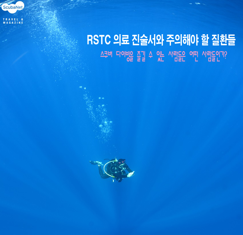 RSTC 의료 진술서와 주의해야 할 질환들 스쿠버 다이빙은 신체 건강한 사람들이라면 누구나 즐길 수 있는 신나고 재미있는 레크리에이션 활동이다. 하지만 동시에 체력적으로 힘든 활동이므로 안전하게 스쿠버 다이빙을 즐기기 위해서는 참가자들의 신체적인 능력도 어느 정도 필요하다. 스쿠버 다이빙을 안전하게 할 수 있는 사람들의 신체 적성에 대한 기준은 세월에 따라 많이 변해왔다. 해군의 작전 활동과 산업 다이빙에서 시작된 스쿠버 다이빙은 초창기에는 매우 엄격한 신체 검사 기준을 가지고 있었다. 그러나 스포츠 다이빙에서 레크리에이션 다이빙으로 그 명칭이 변경되는 것에서 느낄 수 있듯이 그 기준은 점차 완화되어 왔다. 스쿠버 다이빙이 그렇게 위험한 활동이 아니라 교육을 통해서 그 위험성을 충분히 통제할 수 있다고 믿게 되었기 때문이다.