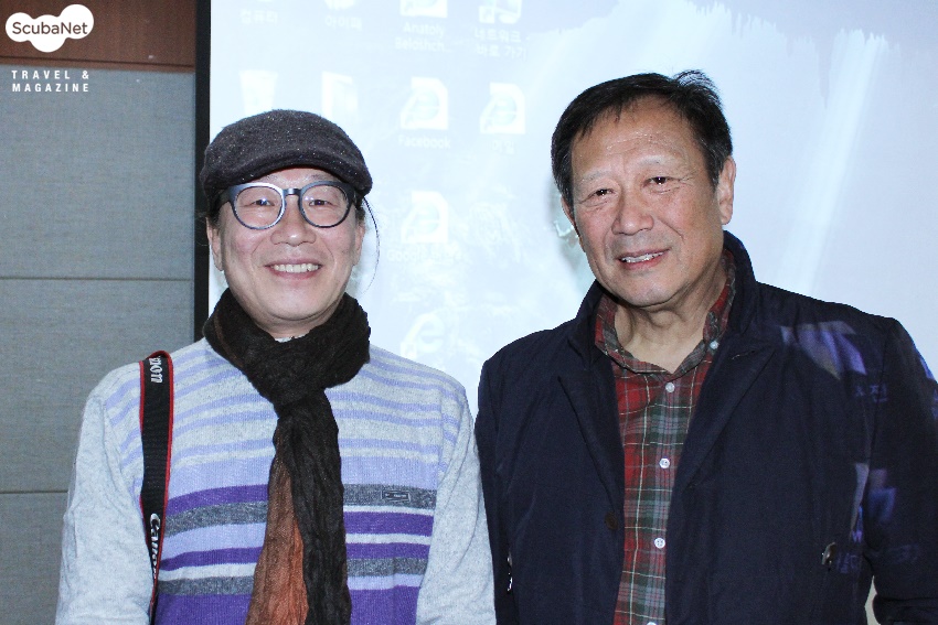 탁기형기자님과 장남원선생님육상 사진을 강의 해주신 탁 기형기자님이 그렇고 수중사진을 강의 해 주신 장남원 선생님도 그러하다. 장 남원 선생님이 수중사진의 처음이라고, 최초라고 유일하다고 그렇게 말하지는 않겠다 그 이전에도 수중사진을 찍으신 분들도 계시니까 하지만 불모지였었던 우리나라 수중사진의 역사에 큰 획을 그으신 분이라고 말 할 수 있을 것 같다.
