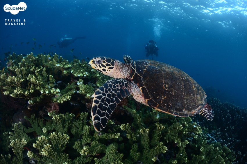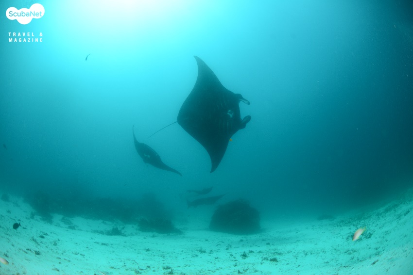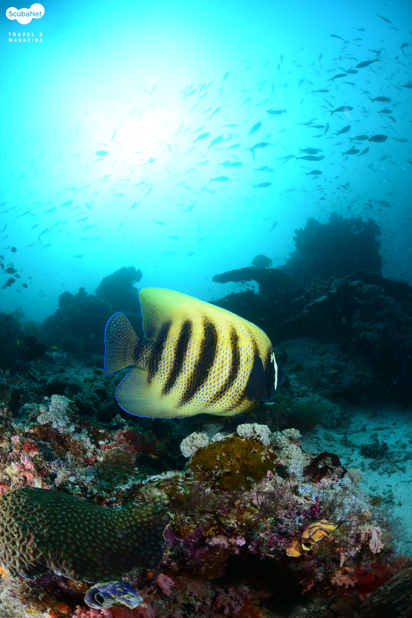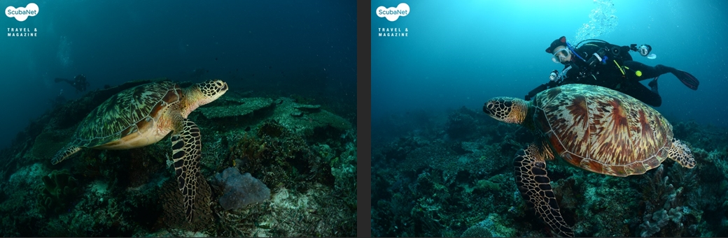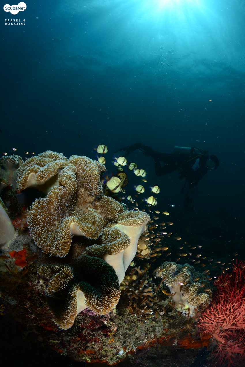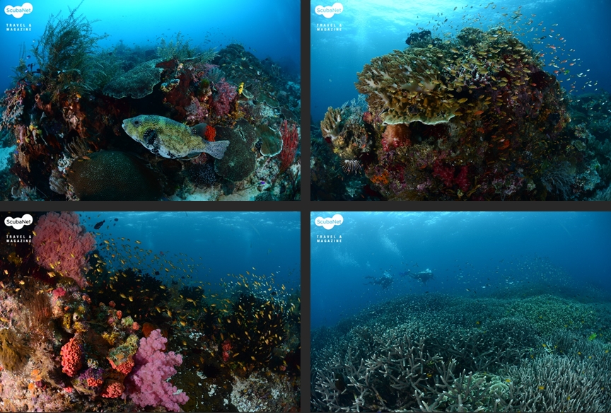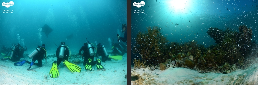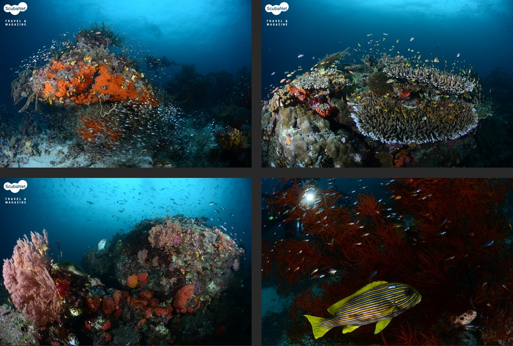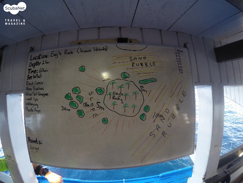●이글락(Eagle Rock, Kawe Island)카웨섬 남쪽에 있는 작은 바위 섬이다. 수심 30m까지 슬로프로 되어 있는 섬의 서쪽에서 입수하여 큰 바위들 사이로 돌아다니며 다이빙을 하다가 얕은 쪽으로 상승하면서 섬을 일주하는 방식으로 다이빙을 진행한다. 서쪽 슬로프의 바위는 블랙코랄과 부채산호들이 숲을 이루며, 제비활치, 푸질리어, 스위트립스 등을 볼 수 있었다. 섬 동쪽의 얕은 수심에서는 만타레이를 볼 수 있었다.