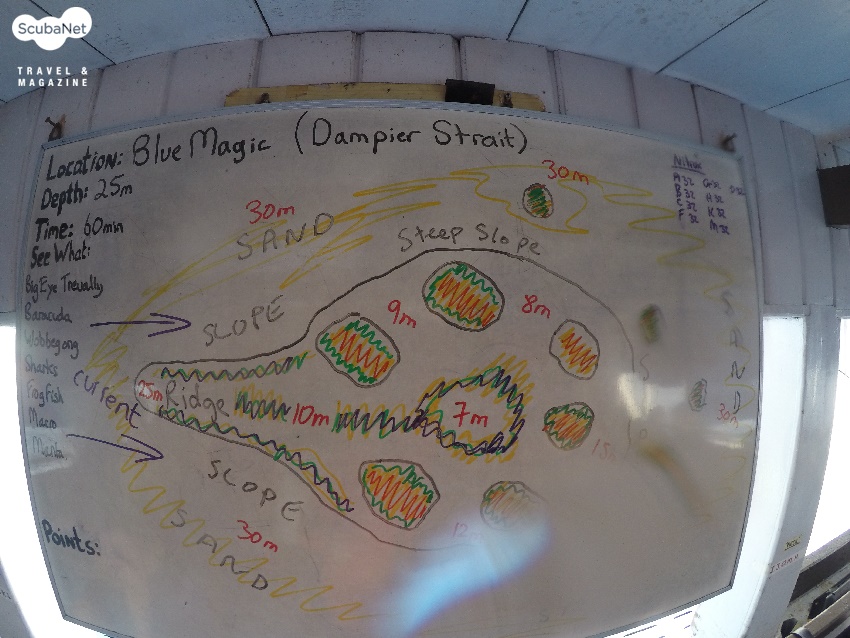 ●블루 매직(Blue Magic, Dampier Strait)미오스콘과 살딘 리프의 사이에 있는 리이프로 수심 30m에서 7m까지 솟아있다. 빅아이 트레발리, 바라쿠다, 우베공 상어, 블랙팁 상어, 프로그피쉬 등을 볼 수 있으며, 리프 상단에 만타 레이의 클리닝 스테이션이 있어서 만타를 볼 수 있다. 조류가 있을 때 물고기들의 활동이 많아 재미있는 다이빙을 할 수 있다. 수심 25m의 리지 쪽에서 입수하여 조류를 따라 흘러가다가 조류가 없는 리프 후면에서 얕은 곳으로 상승하면 된다. 마크로 생물들도 많이 있다. 우리가 다이빙하는 동안 자이언트 만타레이 2마리가 클리닝 서비스를 받고 있다가 계속해서 리프 상단을 선회하여 좋은 구경거리와 촬영기회를 주었다.