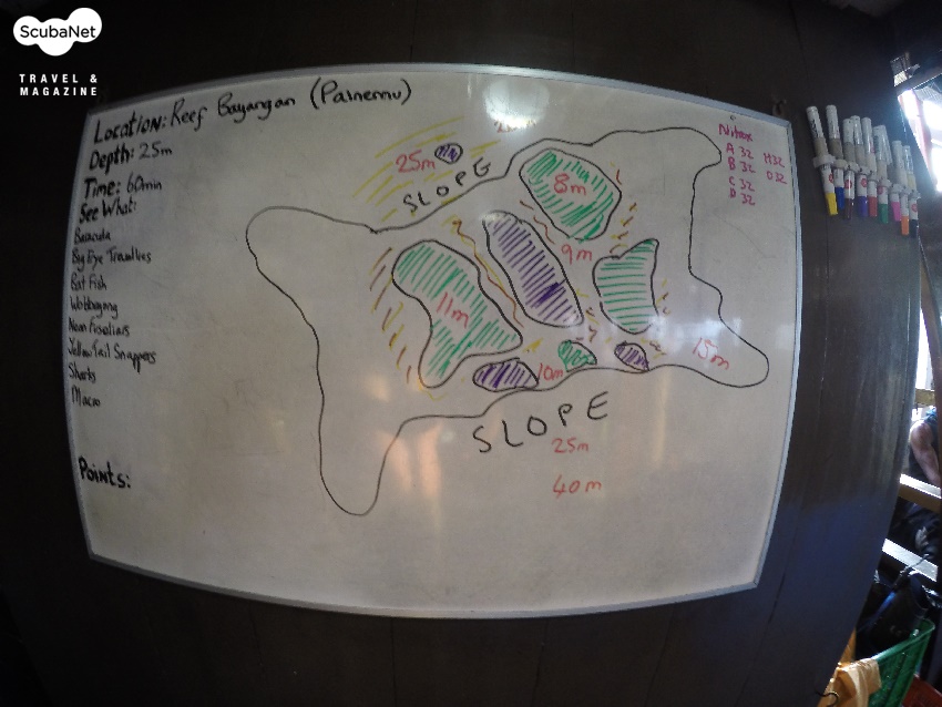 ●리프 바양간(Reef Bayangan, Painemu)페이네무 섬의 북쪽에 있는 수심 25m에서 8m까지 솟은 리프로 완만한 슬로프와 봉우리의 산호뭉치 등을 돌아다니며 다이빙을 즐길 수 있다. 바라쿠다, 잭피쉬, 푸질리, 스위트립스 등이 무리를 지어 있으며, 얕은 수심에서 우베공 상어가 낮잠을 자고 있는 것도 볼 수 있었다. 스위트립스는 25m 모랫바닥 작은 바위의 블랙코랄 가지 속에 몸을 숨기고 있다. 가까이 접근해도 도망가지 않으므로 촬영하기에 좋다. 전체적으로 광각사진을 촬영하기에 좋은 곳이었다.