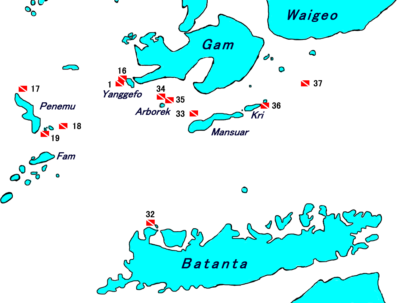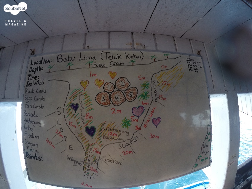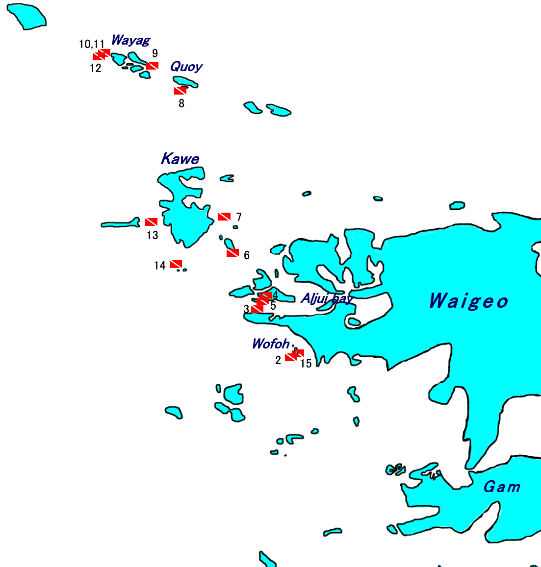 ●바투 리마(Batu Lima, Teluk Kabui, Pulau Gam)감 섬 근처의 작은 바위 섬들로 하나로 보이지만 버섯 모양의 바위 5개가 모여있는 곳이다. 수심 2m의 얕은 바닥에 부채산호와 연산호들이 부착되어 있어서 수면의 바위 및 나무와 산호들을 함께 촬영할 수 있는 곳이며, 파도가 없다면 반수면 사진을 시도해도 괜찮을 곳이다. 작은 절벽과 슬로프 그리고 리지가 이어지는 곳으로 부채산호와 블랙코랄 그리고 글라스피쉬 등을 볼 수 있다. 광각을 좋아하는 수중사진 다이버라면 매우 좋아할 것이다.