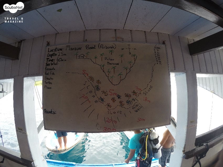 ●만수어르 바랏(Mansuar Barat, Arborek)만수어르 섬의 코너로 수심 20m에서 5m까지 슬로프로 이루어져 있다. 슬로프를 따라 지나가며 산호뭉치들과 함께 어울려 살아가는 어류들을 구경하는 다이빙이다. 글라스피쉬들이 많으며, 옐로우테일 푸질리어, 안티아스 등이 무리를 이루고, 스위트립스, 엠페로피쉬 등도 보인다.