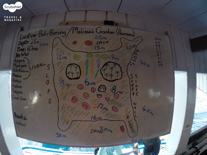 ●바투부룽(Batu Burung/Melissa’s Garden, Painemu)작은 섬 2개 주변으로 폭넓게 리프가 발달해 있는데 수심 20m~25m에서 모래지역과 만난다. 완만한 경사를 유지하고 있는 슬로프를 따라 다니며 산호뭉치들을 중심으로 관찰하다가 얕은 수심으로 상승하면 된다. 수심 10m 이내의 리프 상단에는 엄청난 규모의 경산호 군락이 잘 보존되어 있으며, 작은 섬 주변으로 얕은 수심에 멋진 부채산호와 연산호 군락이 있고, 안티아스들이 무리를 이루고 있다.