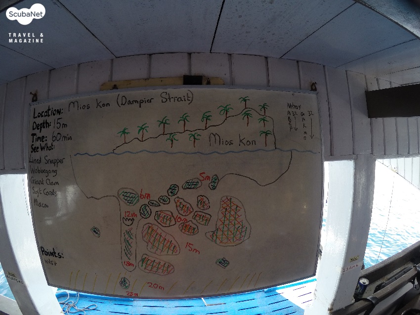 ●미오스콘(Mios Kon, Dampier Strait)주로 체크 다이빙이 이루어지는 곳으로 수심 6m~15m까지의 완만한 경사지에 군데군데 코랄헤드들이 흩어져 있다. 푸질리어 무리, 라인드 스내퍼 무리, 글라스피쉬 무리, 연산호 등이 있고, 마크로 생물들도 많이 볼 수 있다. 가끔 나폴레옹피쉬와 범프헤드 패롯피쉬들도 보였으며, 우베공 상어도 숨어 있다. 체크 다이빙 포인트라고 해서 거저 그런 곳이 아니며, 엄청난 무리의 어류들에 놀라게 된다. 카메라를 두고 입수한 것이 아쉽다면 항해를 마치는 날 마지막으로 다시 한번 찾아 볼 기회를 주기도 한다.